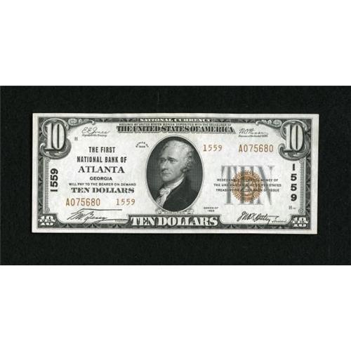 <B>Atlanta, GA</B></I> - $10 1929 Ty. 2 <B>The First NB</B></I> Ch. # 1559<BR> An evenly margined example that is deeply embossed. <B>Gem Crisp Uncirculated</B></I>.<BR><BR><b>Shipping:</b> Coins & Currency (<a target="_blank" href="http://www.heritageauctions.com/common/shipping.php">view shipping information</a>)