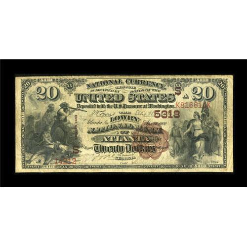 <B>Atlanta, GA</B></I> - $20 1882 Brown Back Fr. 504 <B>The Lowry NB</B></I> Ch. # (S)5318<BR> $20 Brown Backs from any location in Georgia are a considerable challenge to locate, even from big city banks. This is a nicely centered <B>Fine</B></I>.<BR><I>From The Amelia Island Collection.</B></I><BR><BR><b>Shipping:</b> Coins & Currency (<a target="_blank" href="http://www.heritageauctions.com/common/shipping.php">view shipping information</a>)