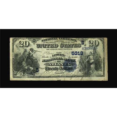 <B>Atlanta, GA</B></I> - $20 1882 Date Back Fr. 555 <B>The Lowry NB</B></I> Ch. # (S)5318<BR> A nice evenly circulated <B>Fine-Very Fine</B></I> example of this tougher Georgia type and denomination. From the bottom of the sheet as it is a bit skewed.<BR><BR><b>Shipping:</b> Coins & Currency (<a target="_blank" href="http://www.heritageauctions.com/common/shipping.php">view shipping information</a>)