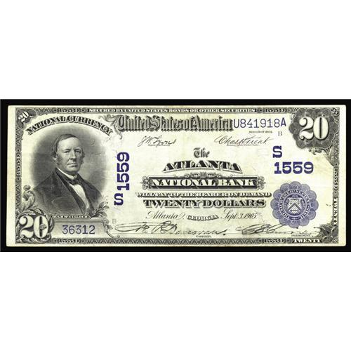 <B>Atlanta, GA</B></I> - $20 1902 Date Back Fr. 643 <B>The Atlanta NB</B></I> Ch. # (S)1559<BR>While 101 large notes are now known from here, only five are of the $20 Date Back variety, all bearing the first of three titles under which the bank issued, including this <B>Very Fine-Extremely Fine</B></I> example, which is quite nicely centered and retains darkly stamped officers' signatures. Even seemingly quite common big city banks can present daunting acquisition challenges to the specialized collector seeking scarcer types and denominations.