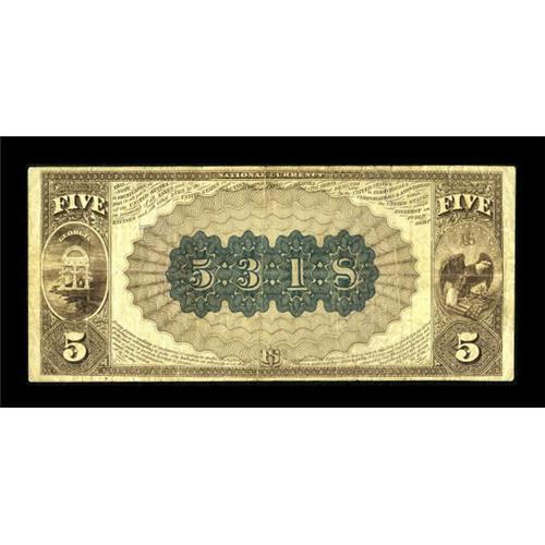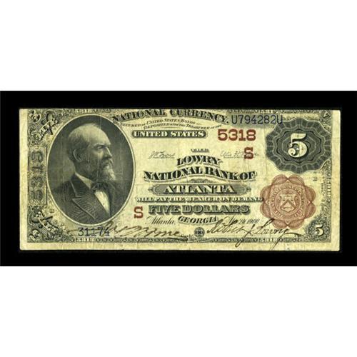 <B>Atlanta, GA</B></I> - $5 1882 Brown Back Fr. 477 <B>The Lowry NB</B></I> Ch. # (S)5318<BR> A decent Brown Back from this private name bank, with this piece bearing the signature of Robert J. Lowry as president. <B>Fine+, </B></I>with the top margin trimmed into the design and a split running about three-quarters of an inch into the note at the top as well. <BR><BR><b>Shipping:</b> Coins & Currency (<a target="_blank" href="http://www.heritageauctions.com/common/shipping.php">view shipping information</a>)