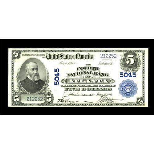 <B>Atlanta, GA</B></I> - $5 1902 Plain Back Fr. 606 <B>The Fourth NB</B></I> Ch. # 5045<BR>A pack fresh <B>Choice Crisp Uncirculated</B></I> from a prolific Peach State issuer. While this note has a few light handling marks, there are no actual folds. It retains full original crispness and is every bit as bright and snappy as the day it came off the press at the BEP.<BR><BR><b>Shipping:</b> Coin/Currency (<a target="_blank" href="http://www.heritageauctions.com/common/shipping.php">view shipping information</a>)