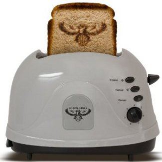 Does your breakfast lack team spirit? Spice up the most important meal of the day with this Pangea Brands® ProToastTM 2-Slice toaster. The retro-style appliance leaves the mark of the Atlanta Hawks emblem on every piece of bread. Features the Hawks logo on the outside and toasts your bread in the Hawks logo. Adjustable settings for desired toasting levels. Includes a setting for frozen breads. Works on white and wheat bread, as well as frozen waffles and English muffins. Made in China, final assembly in USA. UL tested and approved. Dimensions: 8'' H x 12'' W x 6'' D.