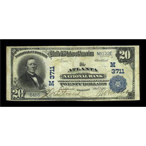 <B>Atlanta, IL</B></I> - $20 1902 Plain Back Fr. 652 <B>The Atlanta NB</B></I> Ch. # (M)3711<BR>This is the only example for type known with a total population of seven large size notes accounted for. CAA last handled this <B>Fine+</B></I> piece in Jan. 2001.<BR><I>From The Lincoln Collection</B></I><BR><BR><b>Shipping:</b> Coins & Currency (<a target="_blank" href="http://www.heritageauctions.com/common/shipping.php">view shipping information</a>)