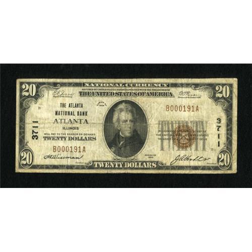 <B>Atlanta, IL</B></I> - $20 1929 Ty. 1 <B>The Atlanta NB</B></I> Ch. # 3711<BR> A pleasing <B>Very Good</B></I> from a none too common issuer that was the sole federally chartered bank in this small community.<BR><BR><b>Shipping:</b> Coins & Currency (<a target="_blank" href="http://www.heritageauctions.com/common/shipping.php">view shipping information</a>)