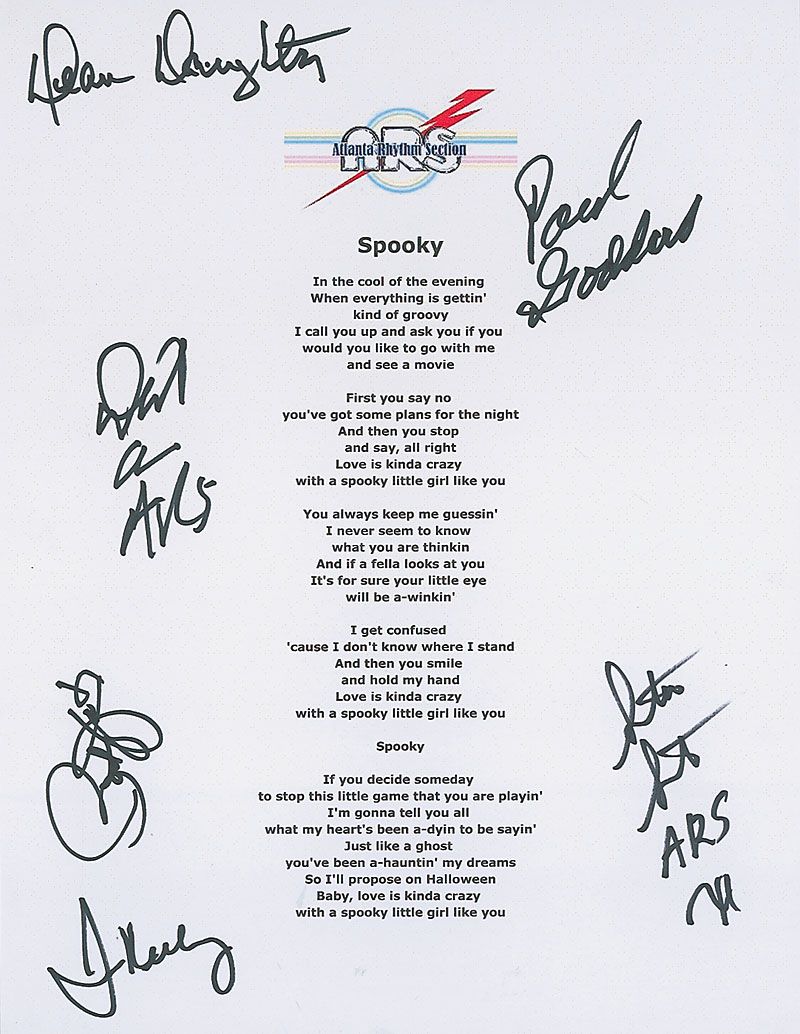 Souvenir printed lyrics to ‘Spooky,’ one page, 8.5 x 11, signed in black felt tip by six members of the Atlanta Rhythm Section: Paul Goddard, Steve Stone, Dean Daughtry, David Anderson, Rodney Justo, and Jim Keeling. In fine condition.
