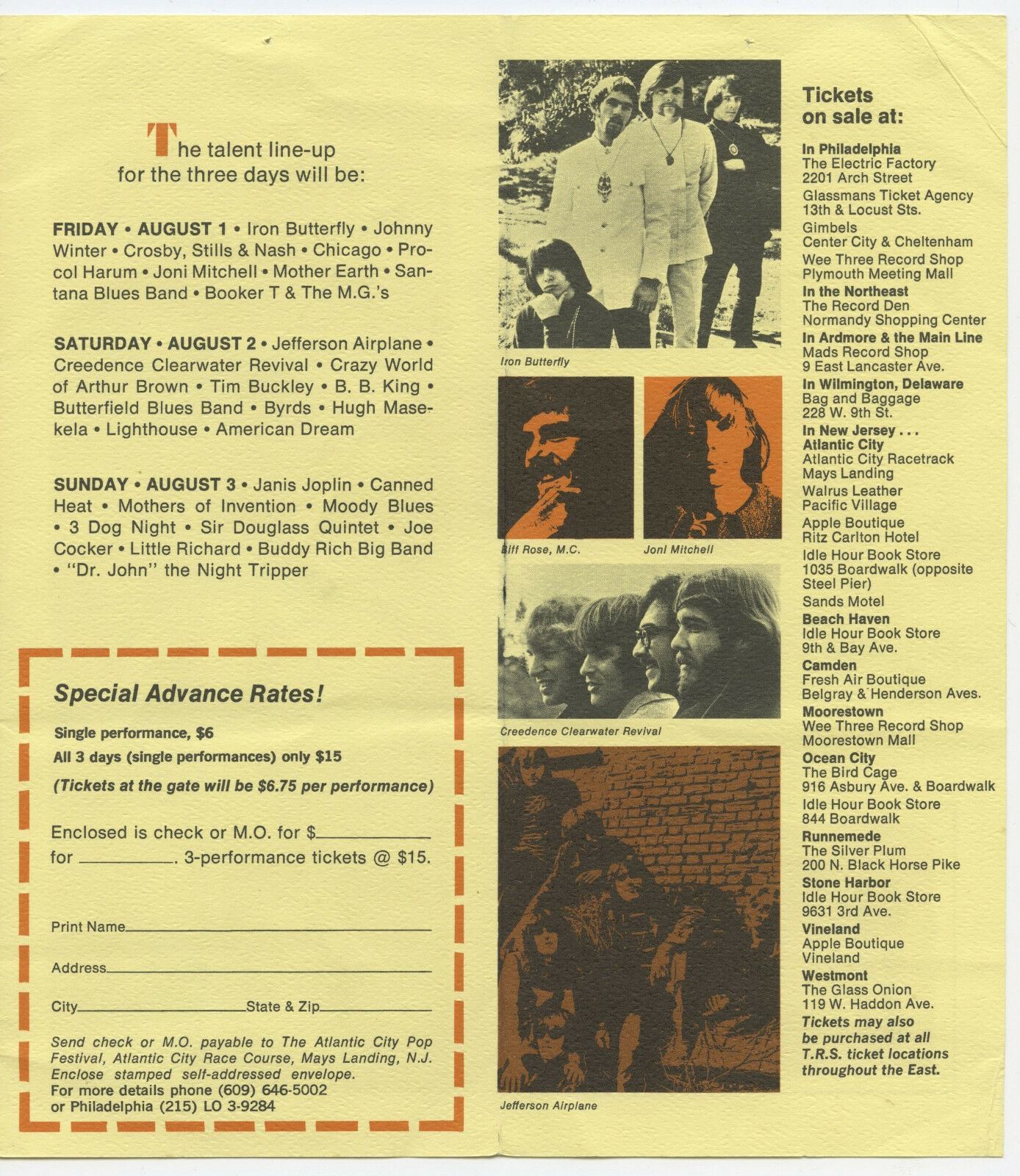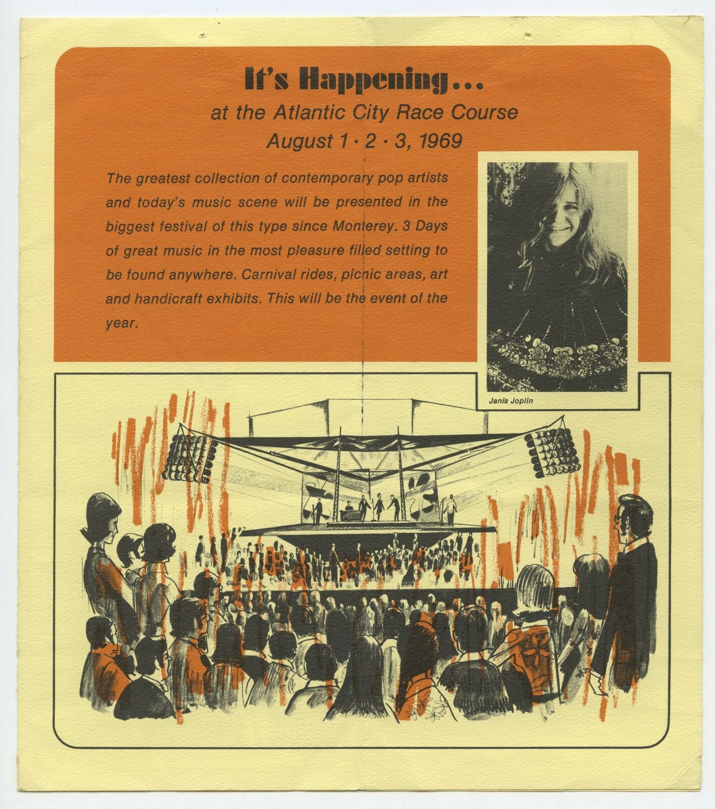 Atlantic City POP FESTIVAL Concert Handbill featuring JANIS JOPLIN. Frank Zappa , JEFFERSON AIRPLANE and many more,