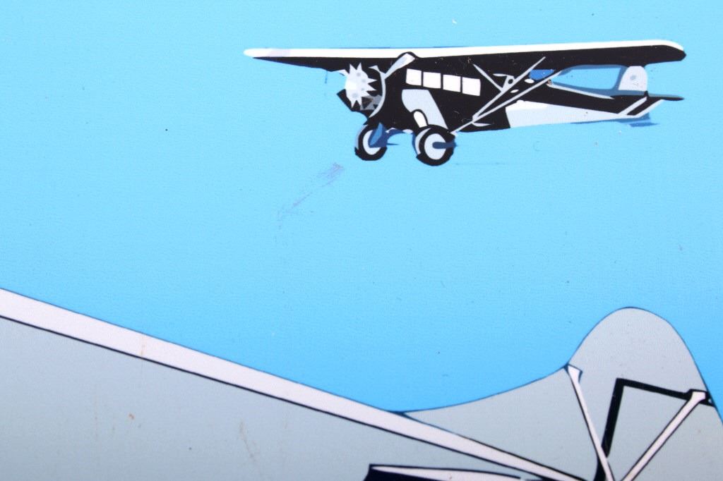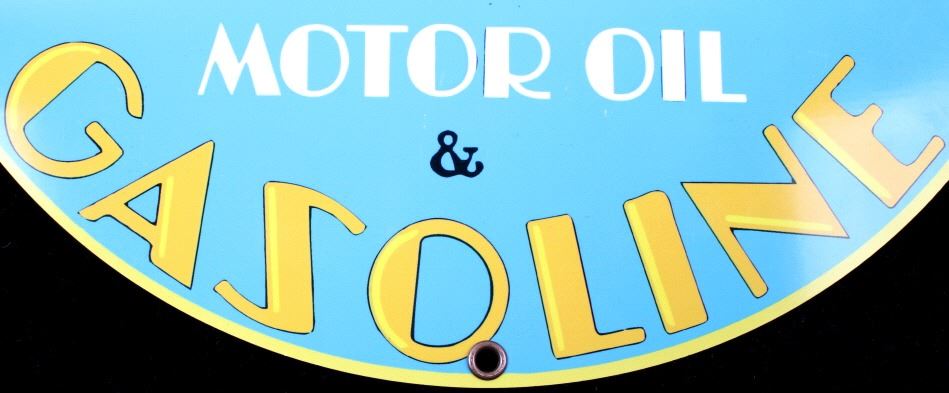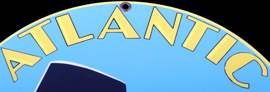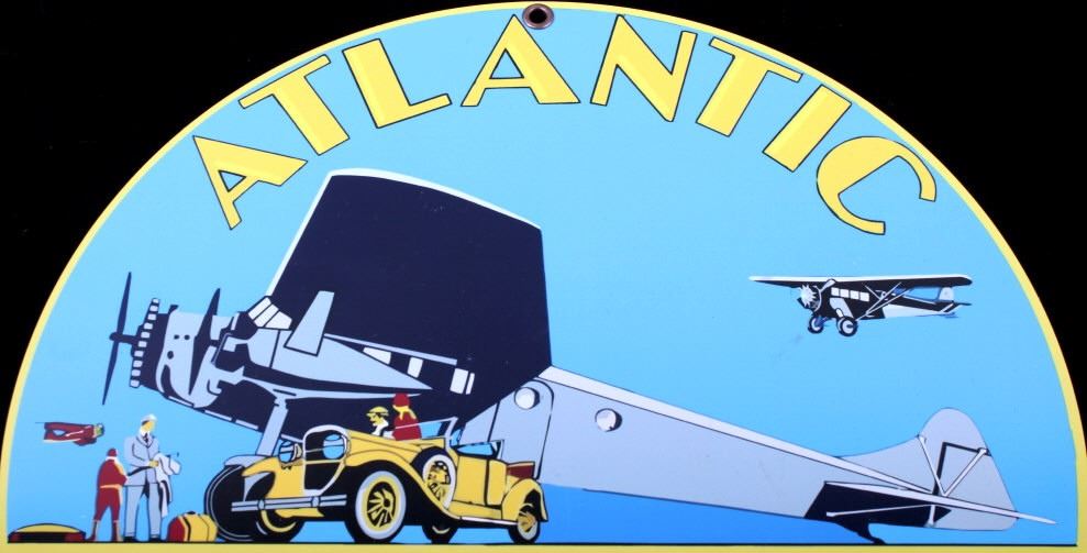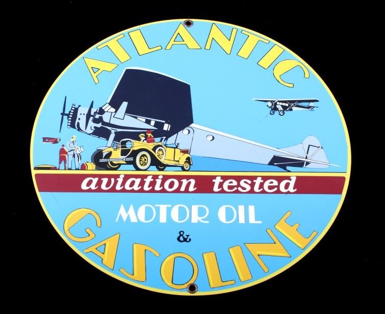 For your bidding pleasure is this Atlantic Gasoline Round Sheet Metal Sign. This round sign is in pristine condition with a yellow border around a blue field with " Atlantic aviation tested Motor oil & Gasoline" centered with Atlantic Gasoline in rocker script above and bellow aq picture of an aviation scene. There is one plane being prepped with its captain out in front of it with a technician in the background; there are two airplanes in the air above the plane with its passenger being dropped off for its flight. The diameter of the sign is 11 3/4". This is a modern replica.