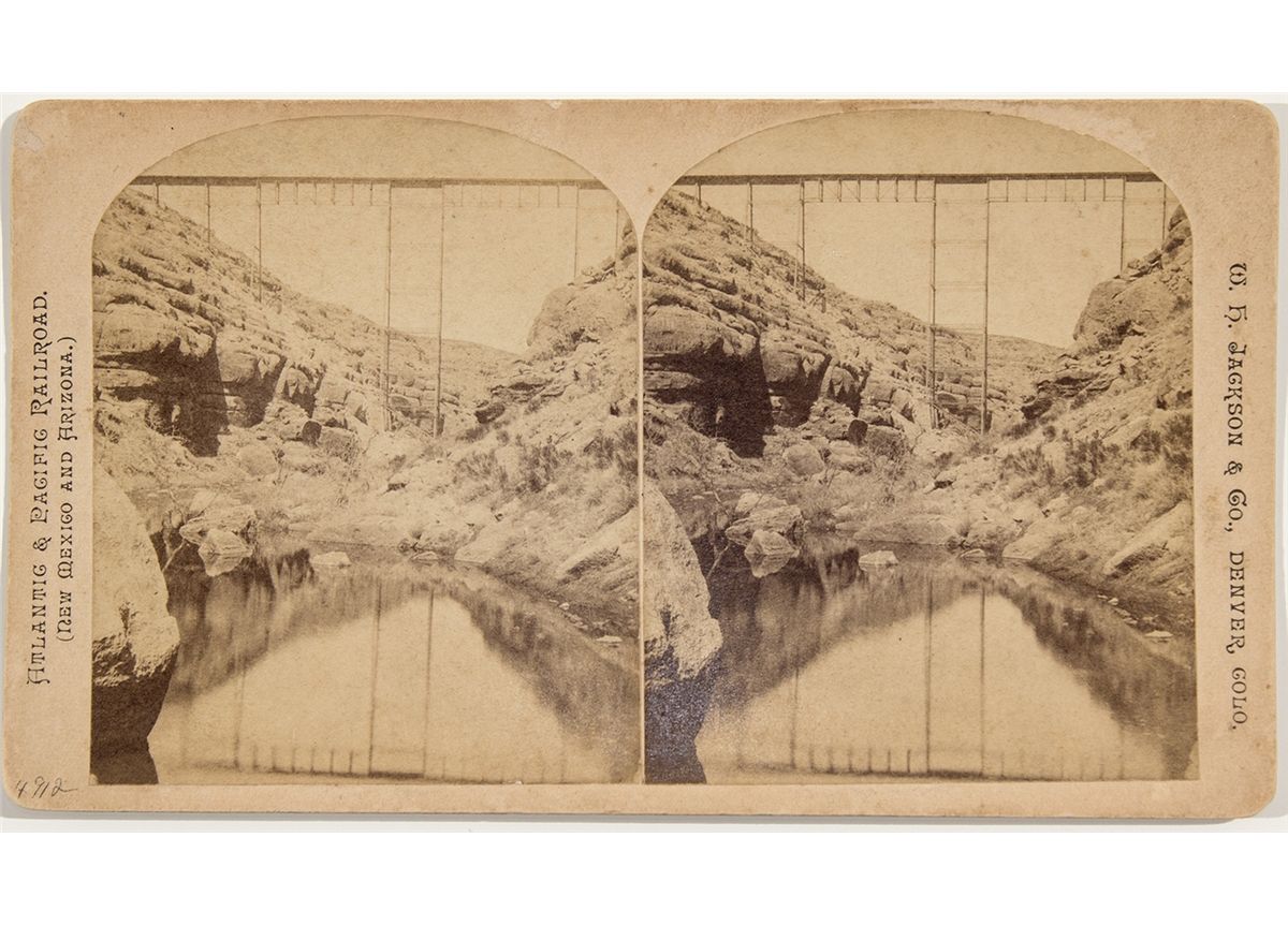 c1880 This is a great undated shot of a bridge, belonging to the Atlantic & Pacific Railroad stretching across a pool in Diablo Canyon Arizona. The photo was taken by W.H. Jackson of Denver, Colorado and has some bleaching on the left panel. Bud Bassett Collection - HKA#65444