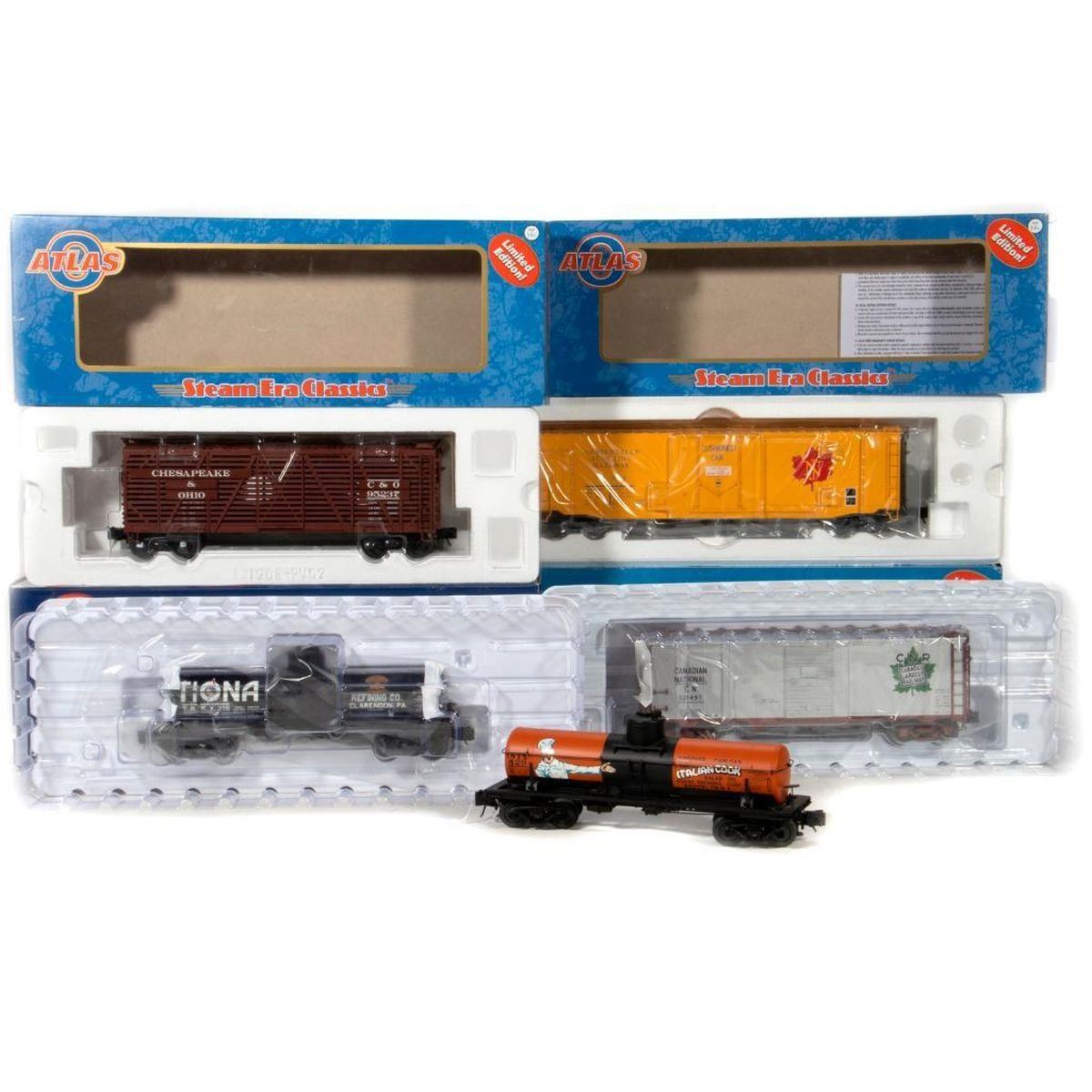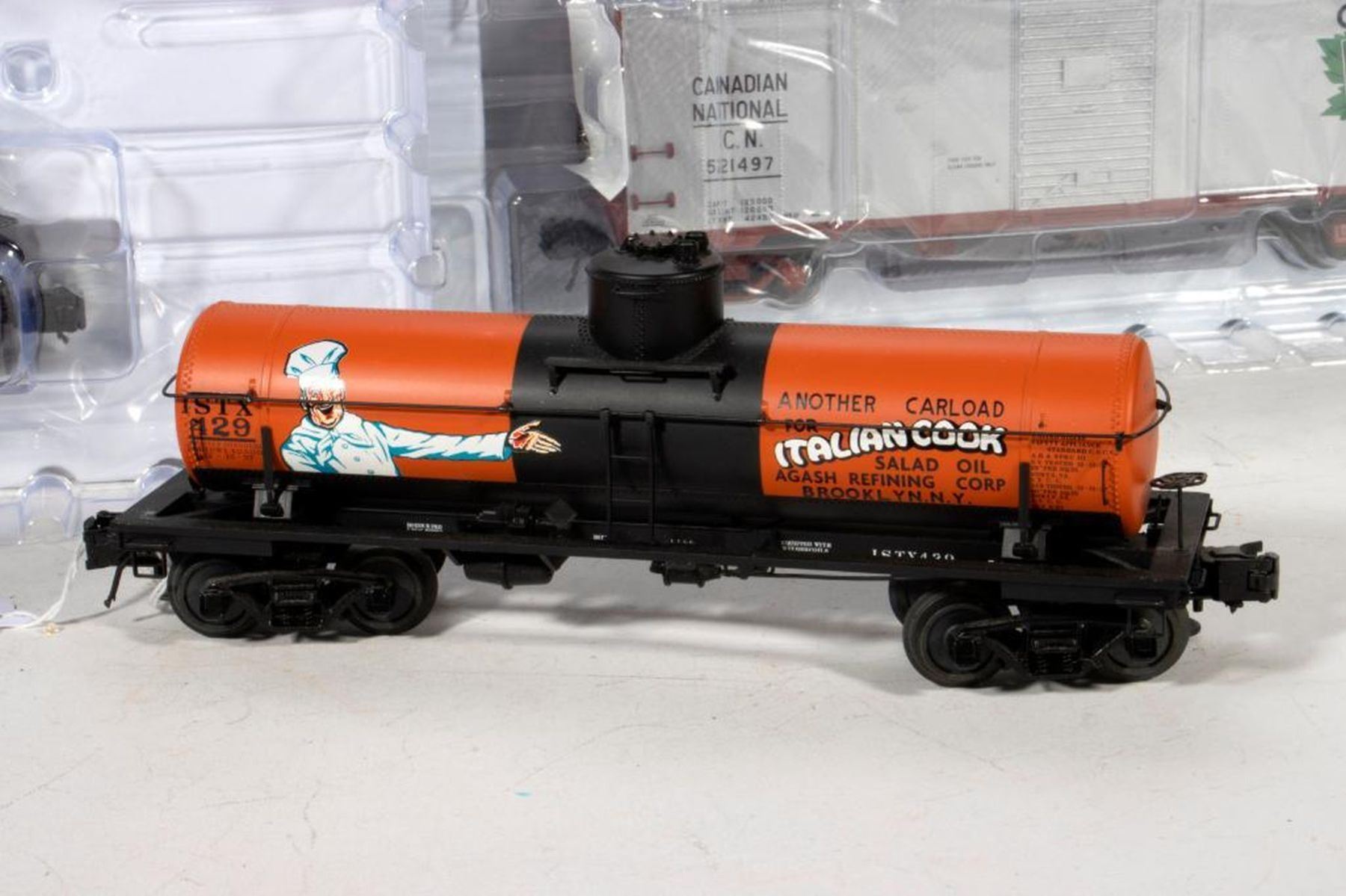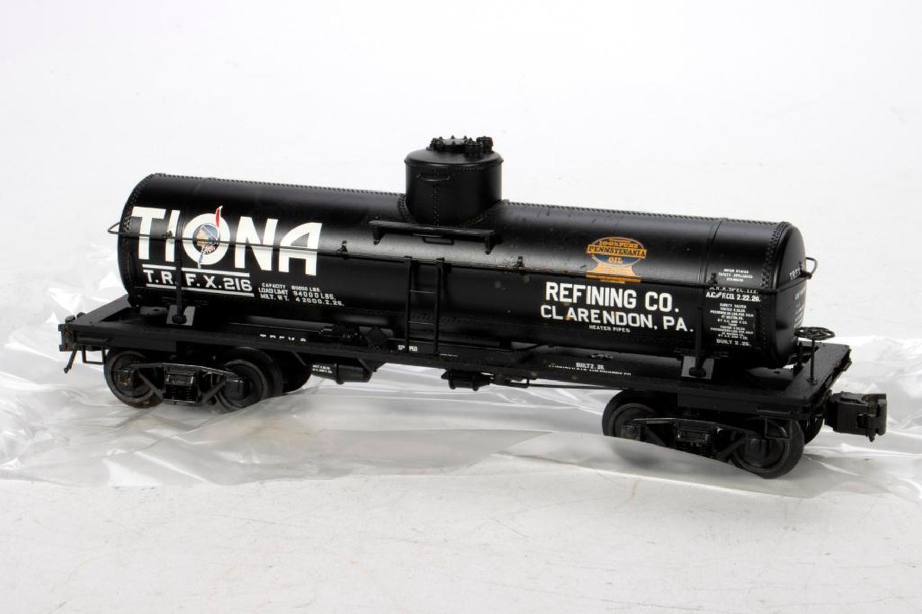3003828-1 Tiona Refining Co. 8,000 Gallon Tank Car, 3001821S Golden Spike Member Exclusive single door box car, 8863 2008 Golden Spike Member Exclusive - Plug door box car, 0606-2 Chesapeake and Ohio Stock Car, Italian Cook Tank Car with broken handrail stanchion. First four have original boxes. Last one no box.