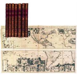 [Atlas] - [CHATELAIN, Zacharias] - Atlas historique, ou Nouvelle introduction à l'histoire, à la chronologie & à la géographie ancienne & moderne; représentée dans de nouvelles cartes (...).  Avec des dissertations sur l'histoire de chaque état, par Mr. Gueudeville, 6 vol. - Supplément à l'Atlas historique (...) avec des dissertations sur chaque sujet par Mr. H.P. de Limiers, 1 vol. Amsterdam, L'Honoré et Châtelain [ou Zacharie Châtelain ou Les frères Châtelain], entre 1714 et 1732,  7 vol., in-folio (rousseurs marginales aux 1ères pp. du t. III, petite déchir. pl. 37/IV, mouillure claire marginale décroissante affectant le titre et le frontisp. du t. V, mouill. marginale intermittente en fond de cahier sans atteinte aux pl. au t. VI, petit trou pl. 31/VI), veau marbré de l'époque, dos à 6 nerfs, caissons ornés dorés, étiq. de cuir rouge, tr. rouges.  Qqs légers frottements, qqs coins émoussés, coupes inf. frottées, 1 éraflure au 1er plat du t. VII, sinon excellente condition de l'époque et bel ex. € 20000/25000 Cfr. ill. Exemplaire complet de ce bel atlas qui constitue une somme géographique, historique et généalogique.  Sa publication s'étendit entre 1705 et 1739 et chaque tome connut au moins 2 éditions.  Les t. I à IV (1721, 1720, id., 1714) concernent l'Europe ancienne (Grèce, Rome...) et moderne y compris la Russie et la Turquie, le t. V (1732) est relatif à l'Asie, le t. VI (1732) à l'Afrique et à l'Amérique, le t. VII (1720) est un supplément surtout chronologique et généalogique. L'illustration se compose de 4 beaux frontisp. allégoriques par Bernard Picart (t. I & V), Romeyn de Hooghe (II) et Goeree (IV). - d'un bandeau dédic. par Wandelaar (VII). - de cartes dépliantes ou sur doubles pages : 1 mappemonde (déchirure sans manque aux plis), 5 cartes des continents (y compris l'Amérique du Nord et l'Amérique du Sud), des cartes générales de pays ou de régions (complet de la célèbre et grande carte en 2 volets titrée Carte très curieuse de la mer du Sud, contenant des remarques nouvelles et très utiles non seulement sur les ports et îles de cette mer. Mais aussi sur les principaux pays de l'Amérique tant septentrionale que méridionale, avec les noms et la route des voyageurs par qui la découverte en a été faite). - et enfin de planches sur simple ou double page figurant des tableaux généalogiques, des vues de villes et de monuments ou des scènes de la vie populaire (moeurs, costumes, divinités, chasse, faune et flore...).  Particulièrement spectaculaires dans les t. V et VI, les cartes sont généralement agrémentées de cartouches plus ou moins élaborés et les planches, avec texte gravé, figurent souvent plusieurs sujets. Bel exemplaire de cet atlas qu'on trouve très rarement complet.  Ex-libris A. Vermylen "canonici Tugrencis". Ref. Koeman II, p. 33 sq. Saffroy 10078 sq.