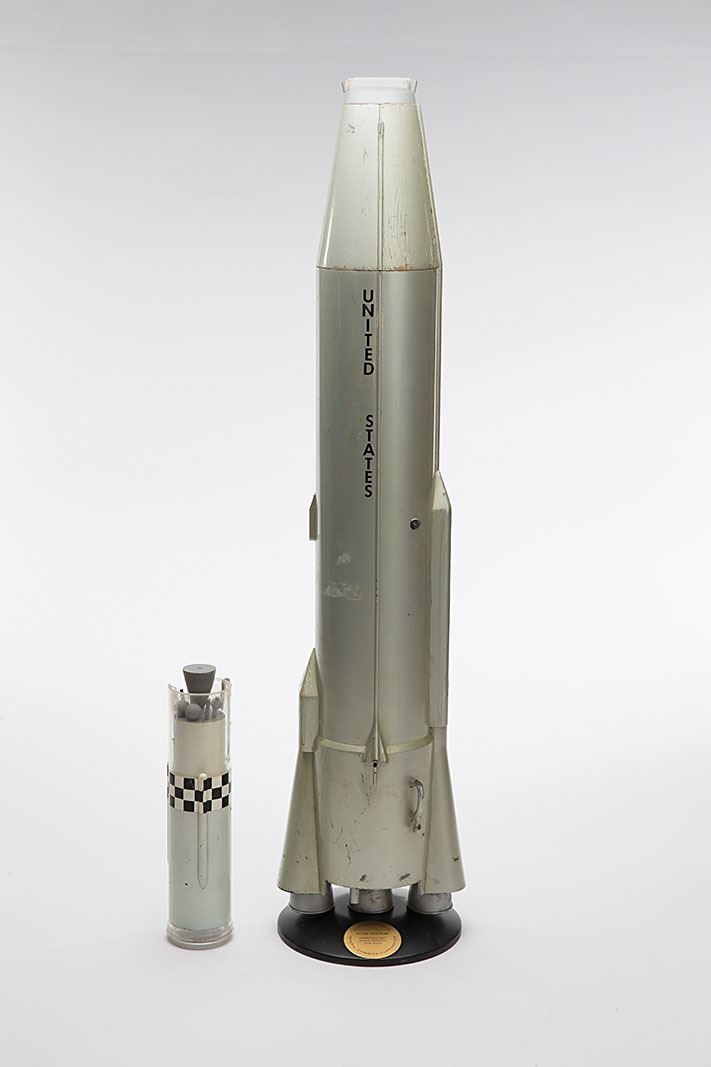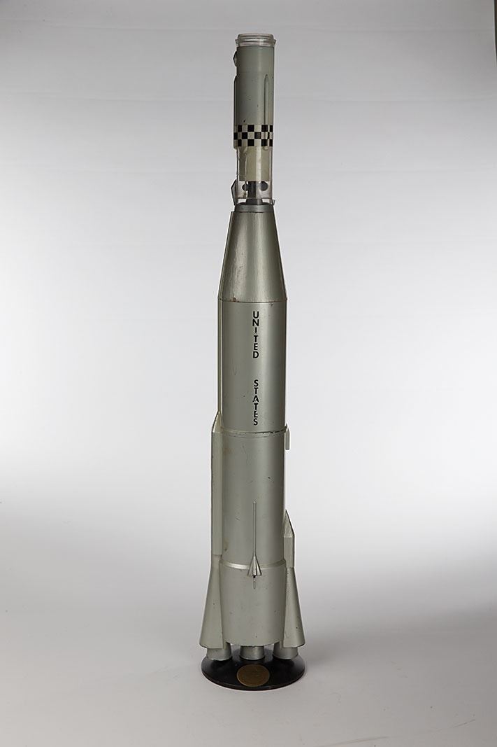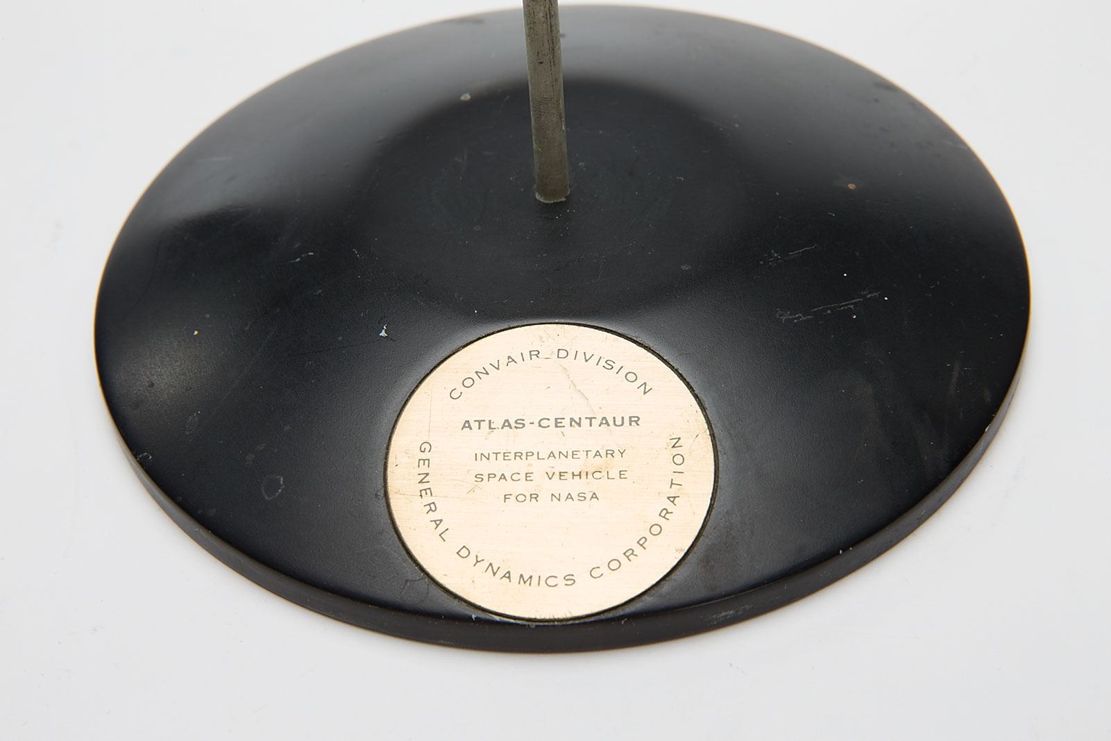 Vintage model of an Atlas-Centaur orbital launch vehicle developed by Convair and General Dynamics Corporation. The model measures approximately 35.25? in height and consists of three sections constructed of various wooden, metal, and plastic parts. The model is displayed on a circular metallic base 5.75? in diameter with embedded golden plate: “Atlas-Centaur, Interplanetary Space Vehicle for NASA.” This incomplete model is without several parts, including uppermost stages, and is in need of restoration. In very good condition, with expected wear from use and storage, such as: scattered soiling and scuffs, cracking and chipping to paint, and cracks and missing plastic top section.