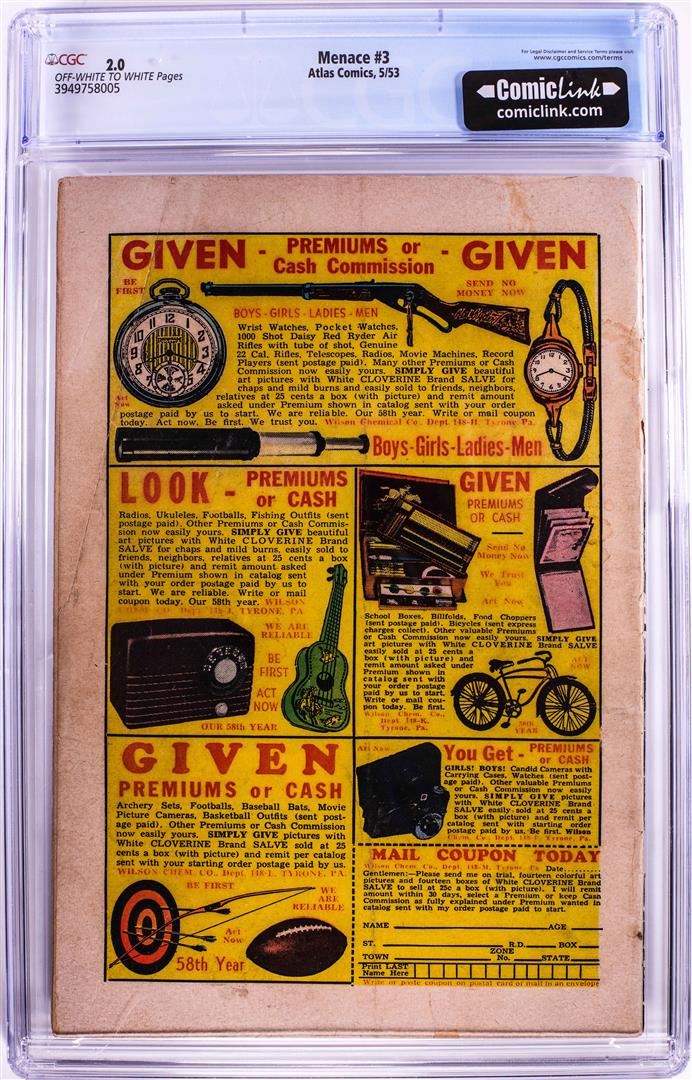 One Atlas Comics Menace #3 Comic Book 5/53 CGC 2.0. CGC Graded.