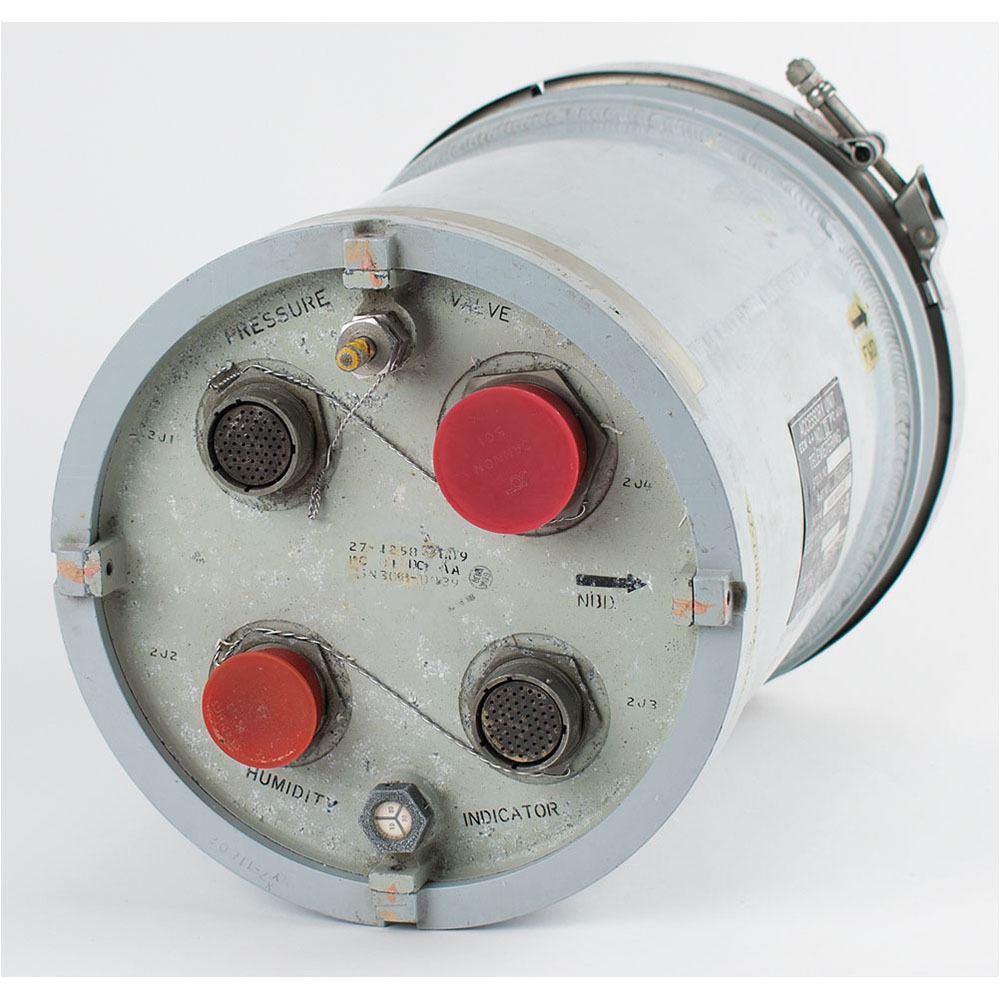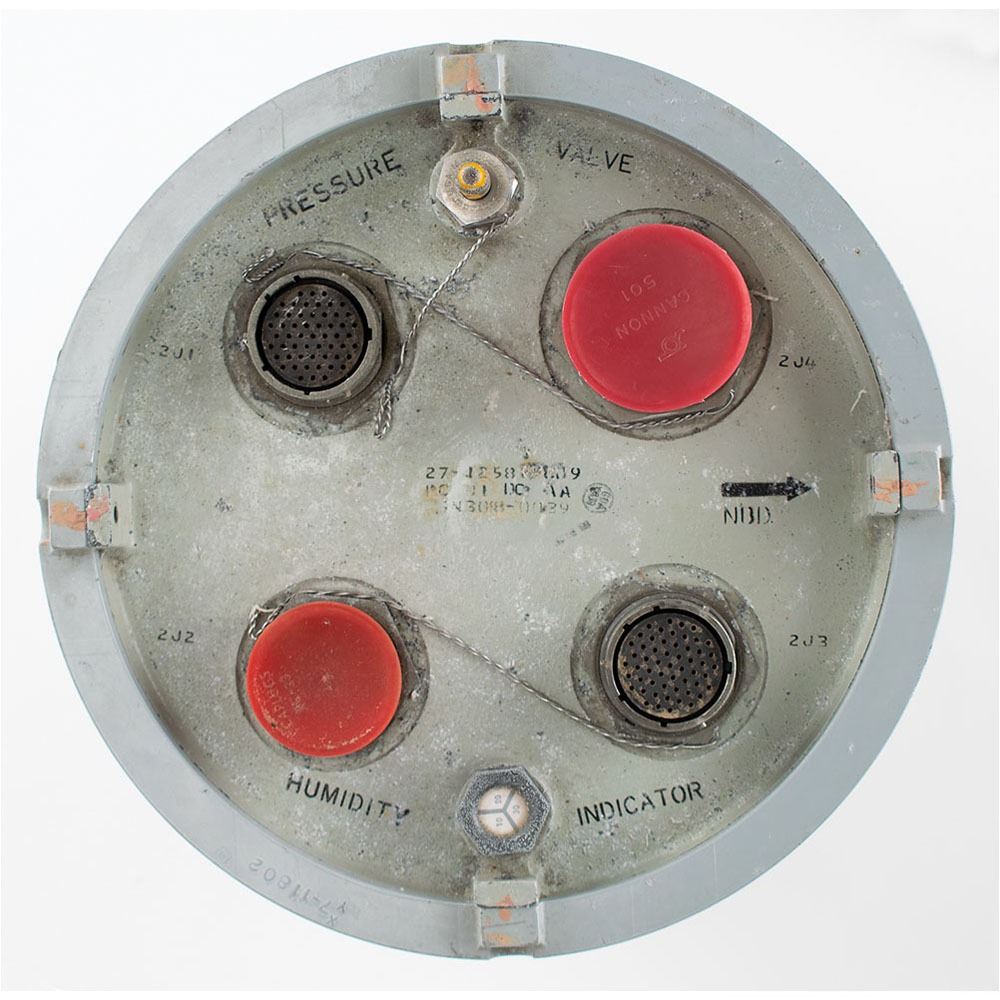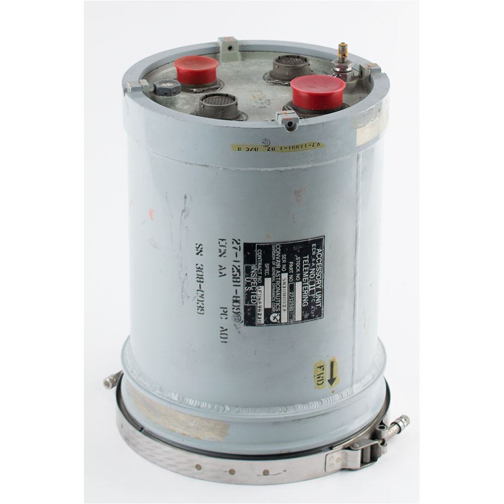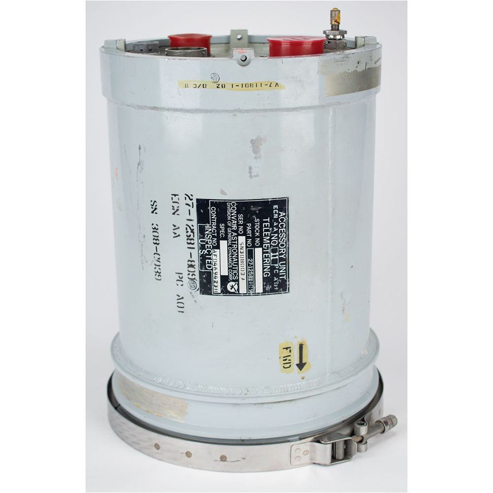 Atlas missile telemetering unit used to report the health and operational state of the launch vehicle/missile during flight, measuring 10.5è in diameter with a height of 14è, with a Convair Astronautics label on the side: "Accessory Unit No. 11, Telemetering‰Û_Part No. 27-12581809, Ser. No. SN3080039‰Û_Contract No. AF046942311."