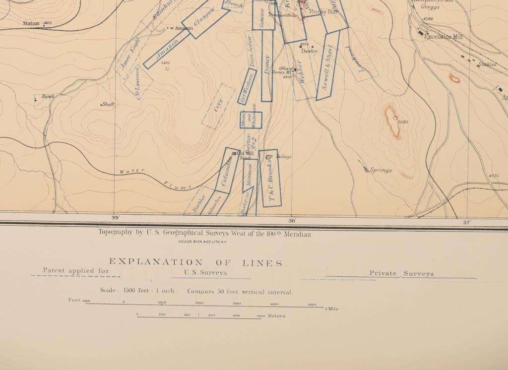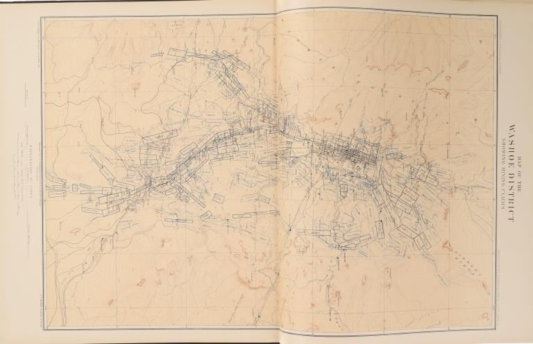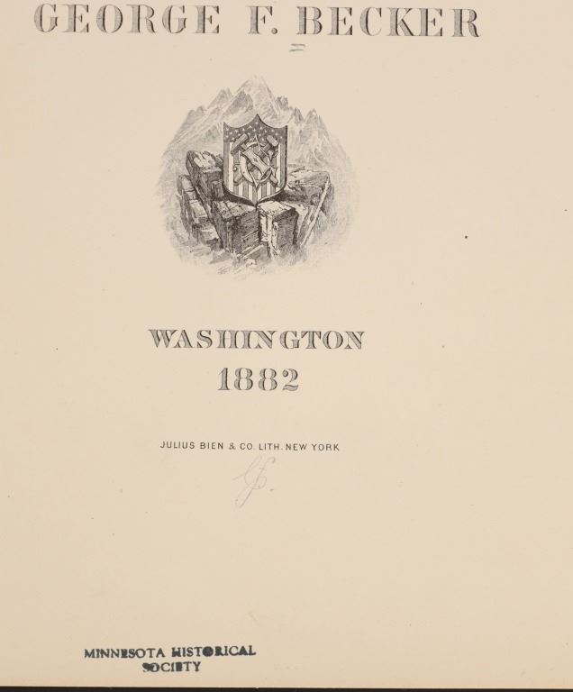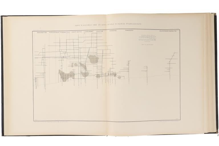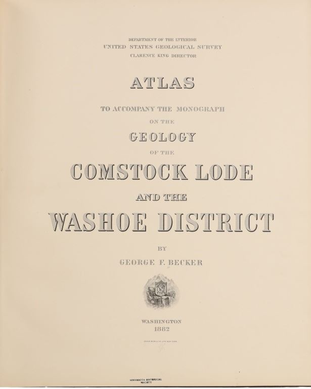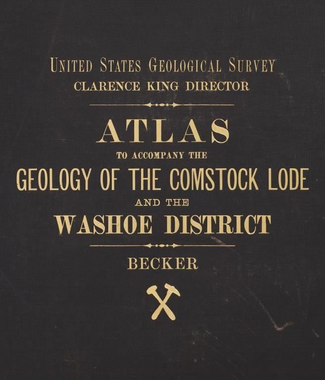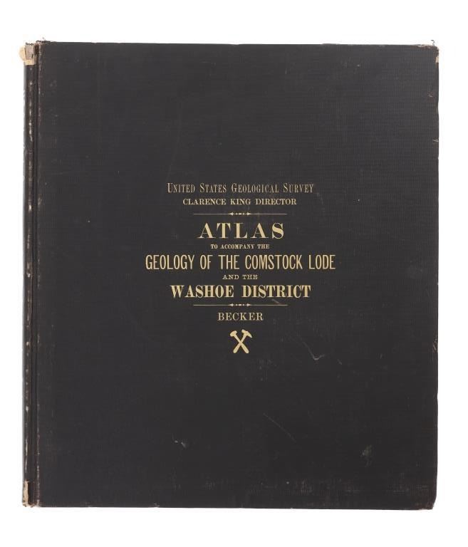 Featured in this lot is this atlas from the United States Geological Survey titled, "Geology of the Comstock Lode and the Washoe District" compiled by George F. Becker circa 1882. Following the Comstock Lode's discovery in 1859, thousands of prospectors descended the slopes of Mount Davidson in western Nevada, which at the time was part of Utah territory, sparking the second major mineral rush in American history. The United States Geologic Survey published this atlas in 1882, but the silver rush had mostly passed by then. Silver production peaked in 1877. Nevertheless, this did not stop Nevada from earning the nickname "The Silver State". Under the direction of Clarence King, the atlas's publisher, George F. Becker designed the maps, and both men were employed by the U.S.G.S. Maps of mining claims, shaft cross sections, and horizontal projections indicating the locations of mineral deposits are all included. The maps of the mines themselves, which show various tunnels and shafts color-coded, are arguably the most interesting. Much of the survey work was done by King himself between 1867 and 1872 during the Geological Exploration of the Fortieth Parallel (better known as the King survey). The atlas shows a black hard cover with the title and authors in gold gilt, while the spine shows the title and author written in white. Overall the atlas shows good condition with some wear present to the spine and corners of the book from its age and use over the years, but no signs of obvious damage is present. The atlas measures 20 1/8" L x 18" W x 5/8" D and weighs 7 pounds and 8 ounces.