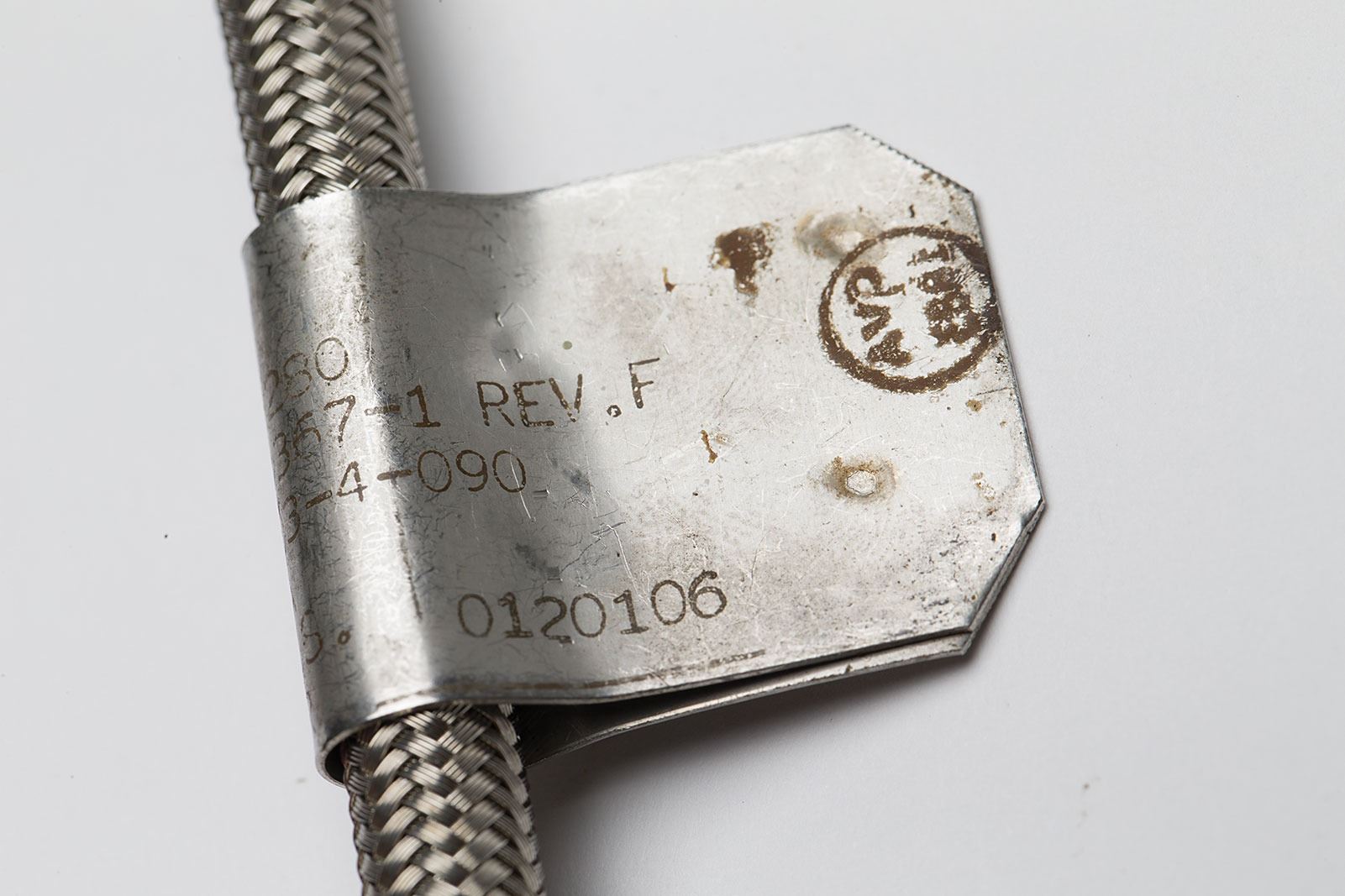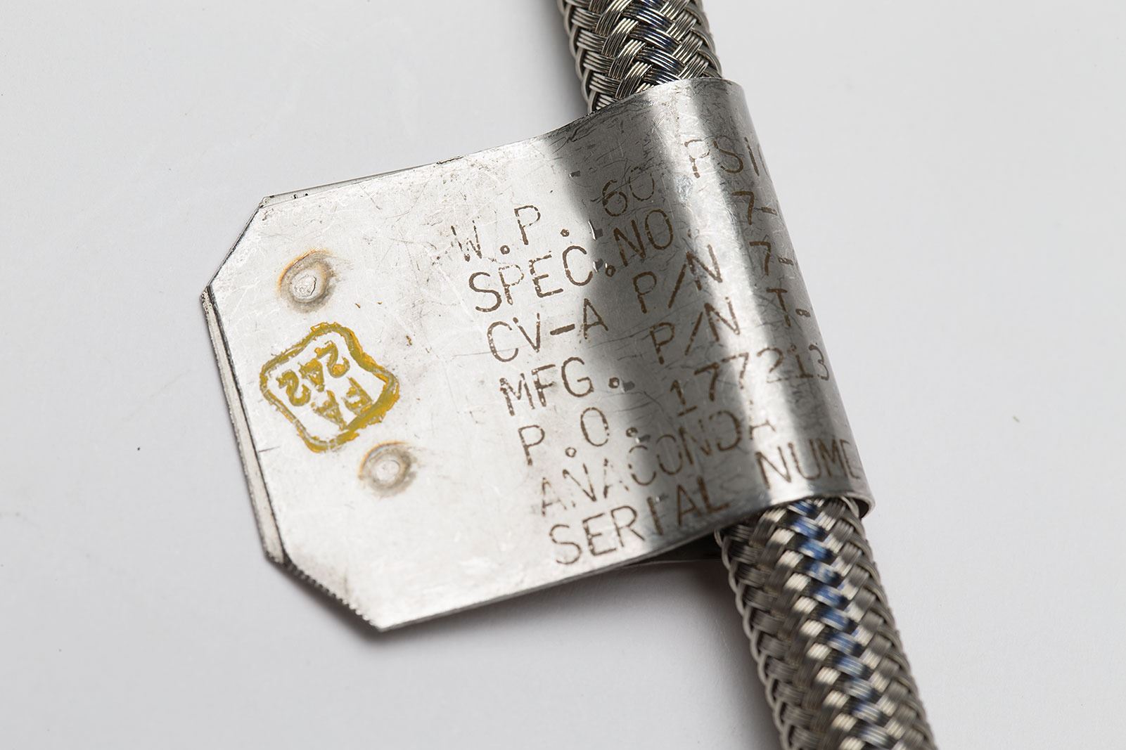 Atlas Rocket Engine Oxidizer Hose, comprised of a braided metal hose measuring 10? long, with a wraparound metal tag reading: "W.P. 60 PSIG, Spec. No. 7-02280, CV-A P/N 7-04367-1 Rev. F, Mfg. P/N T-103-4-090, P.O. 177213 A, Anaconda U.S., Serial Number 0120106." A green, gray, and white label at the other end reads, "Rocket Oxidizer." In fine condition.