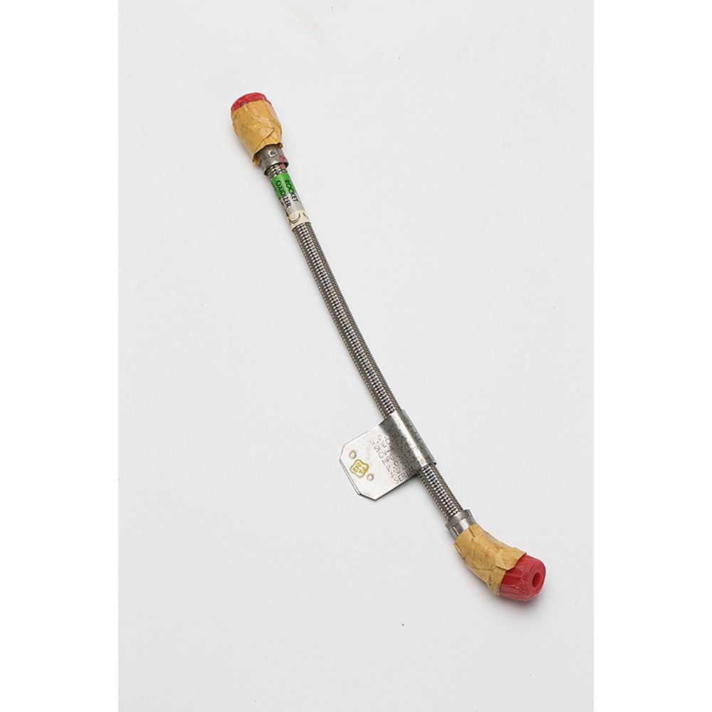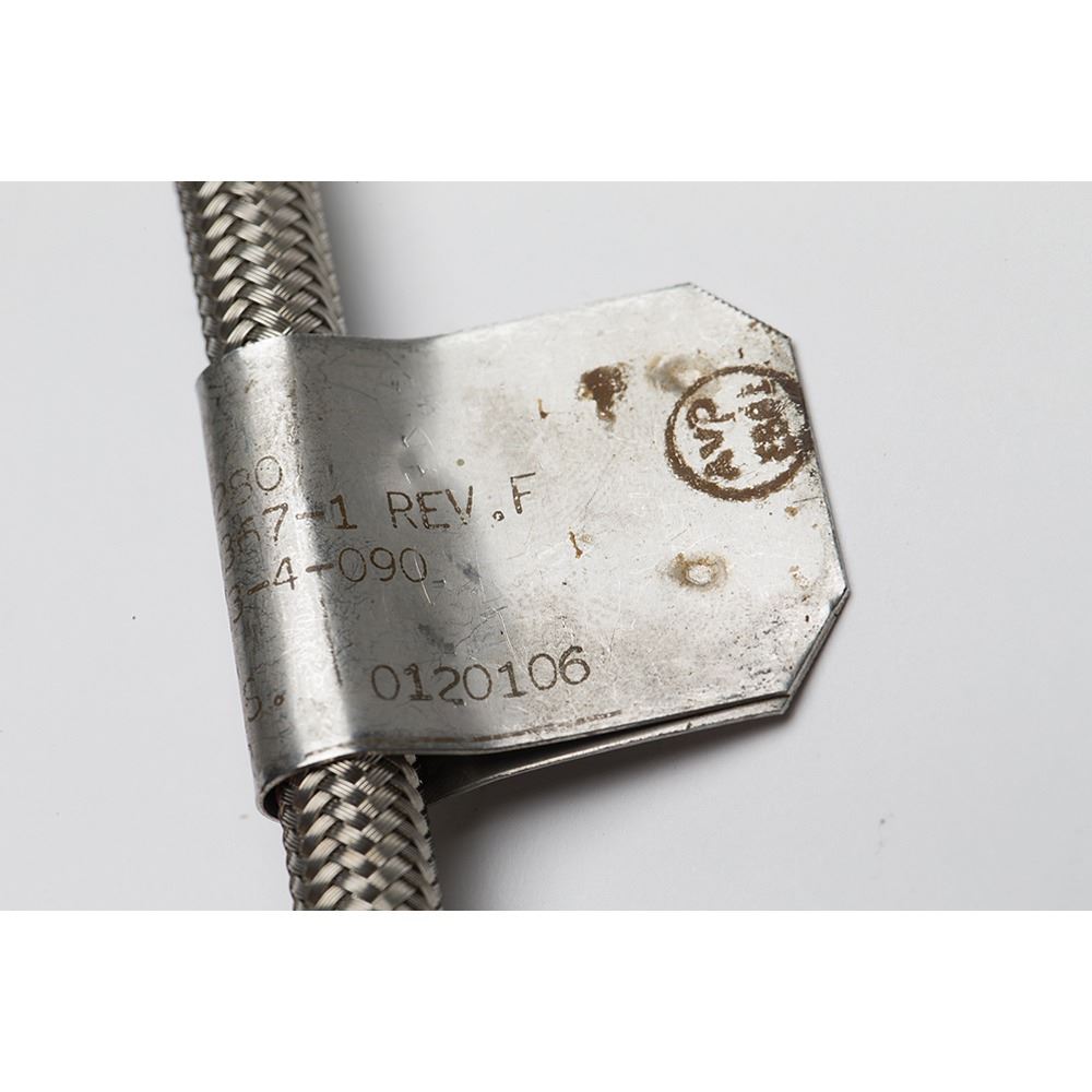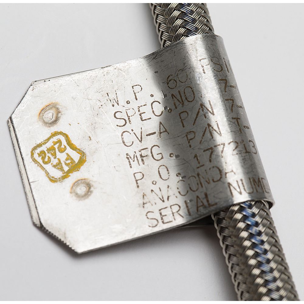 Atlas Rocket Engine Oxidizer Hose, comprised of a braided metal hose measuring 10Àù long, with a wraparound metal tag reading: "W.P. 60 PSIG, Spec. No. 7-02280, CV-A P/N 7-04367-1 Rev. F, Mfg. P/N T-103-4-090, P.O. 177213 A, Anaconda U.S., Serial Number 0120106." A green, gray, and white label at the other end reads, "Rocket Oxidizer." In fine condition.