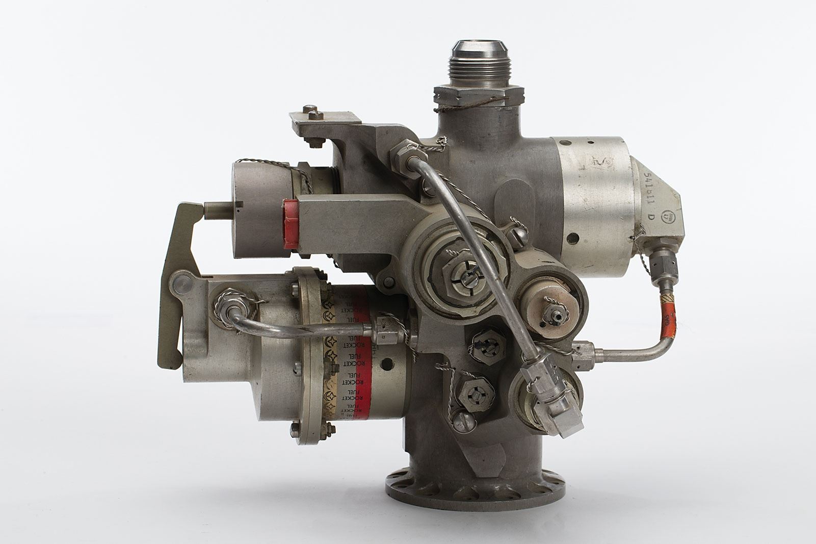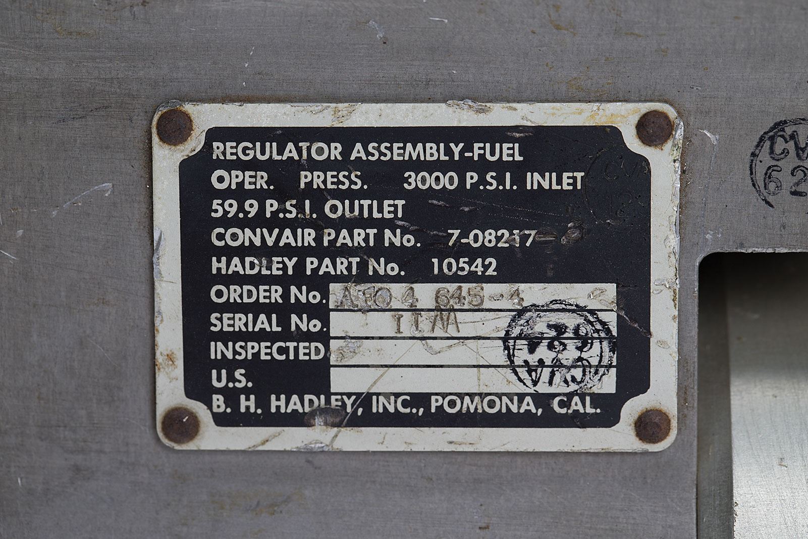 Atlas Rocket Fuel Pressure Regulator, measuring 10.5? x 9? x 9?, with a B. H. Hadley tag on the side, reading: "Regulator Assembly-Fuel, Oper. Press. 3000 P.S.I. Inlet, 59.9 P.S.I. Outlet, Convair Prt No. 7-08217, Hadley Part No. 10542, Order No. AFO 4 645-4, Serial No. IIM." A red, gray, and white band around the center reads, "Rocket Fuel." In fine condition.