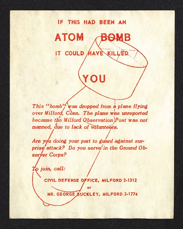 Civil Defense Milford CT recruiting flier. 4x5 inches, paper tone, folded once horizontally.
