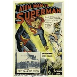 <B>Atom Man vs. Superman (Columbia, 1950)</B></I> One Sheet (27" X 41"). The second of Columbia's Superman serials, the 15-episode "Atom Man vs. Superman" stars Kirk Alyn. Once again, Superman must do battle with his old nemesis, Lex Luthor, this time disguised as Atom Man, who threatens to destroy Metropolis with his disintegration machine. This poster is from Chapter 1 and is titled "Superman Flies Again," featuring a nice shot of Alyn rescuing two victims. There is fold line wear with substantial areas of paper loss at the bottom and middle crossfold, and small holes, tears and multiple pinholes in the graphics. There are also tears, small holes, and multiple areas of paper loss around the borders. The poster has been professionally restored, rendering these defects hard to detect. This poster displays much better than its grade. Good/Very Good on Linen.