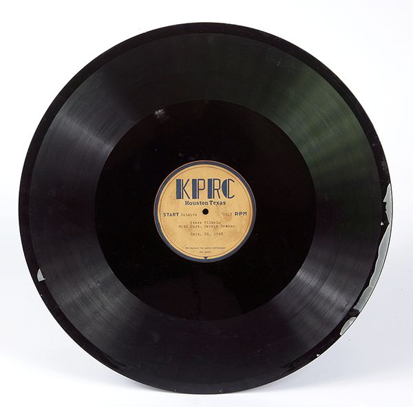 Atomic Bomb, 1945, 33.3 Rpm Master Record Interview. With Captain Kermit Beahan, Bombardier of Bockscar, the plane that dropped the atomic bomb on Nagasaki on 6 August 1945, thus helping to end WW II. This 16" aluminum disc with one-sided vinyl impression recording is one of the first interviews Capt. Beahan recorded after the flight. The label on the recording reads: "KPRC / Houston Texas / Steve Wilhelm with Capt. Kermit Beahan / Sept. 26, 1945". Some vinyl edge faults, but a piece of history. The recording is purported to tell of his experiences and impressions during the flight. About 15 years ago the record was played and the audio was clear. An important first-person view on one of the most important events of the 20th century.