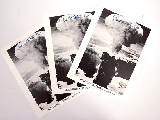 Atomic Bomb, Paul Tibbets Autograph. Lot of three autographs on seperate 8x10" black and white reprint photos of the atomic bomb exploding over Hiroshima during WW II. Tibbets was the pilot of the Enola Gay, the B-29 from which the bomb was dropped. Each is boldly signed in blue.