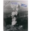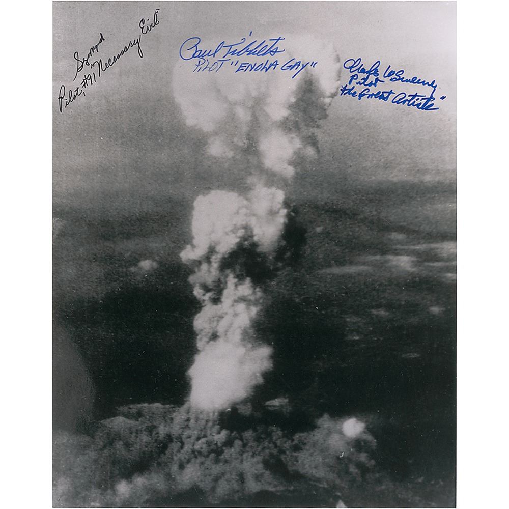 Glossy 8 x 10 photo of the mushroom cloud over Hiroshima, signed in blue and black felt tip by Paul Tibbets, Charles W. Sweeney, and George Marquardt, with each adding his plane and flight assignment below. In fine condition.