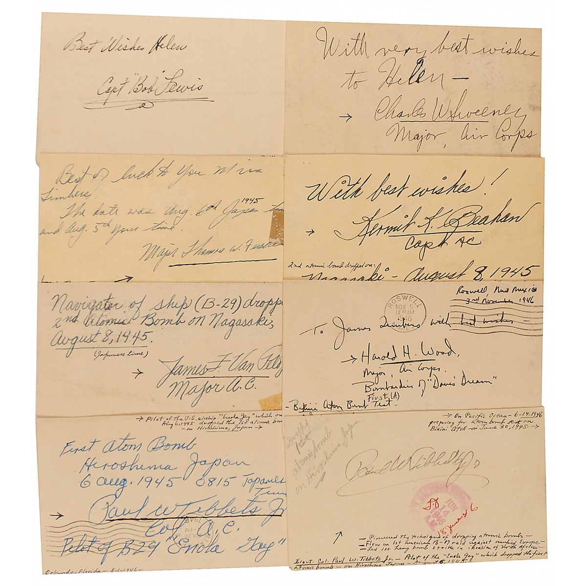 Eight ink signatures on individual government postcards, each signed by a different member of the atomic bomb crew. Signers are: Harold Wood, Kermit Beahan, Paul Tibbets (2), Charles Sweeney, James Van Pelt, Thomas Ferebee, and Bob Lewis. In very good condition, with various scattered toning, soiling, and trimmed edges.