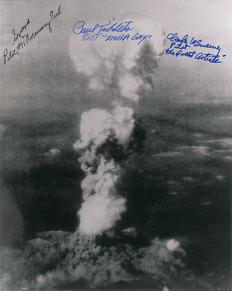 Glossy 8 x 10 photo of the mushroom cloud over Hiroshima, signed in blue and black felt tip by Paul Tibbets, Charles W. Sweeney, and George Marquardt, with each adding his plane and flight assignment below. In fine condition.