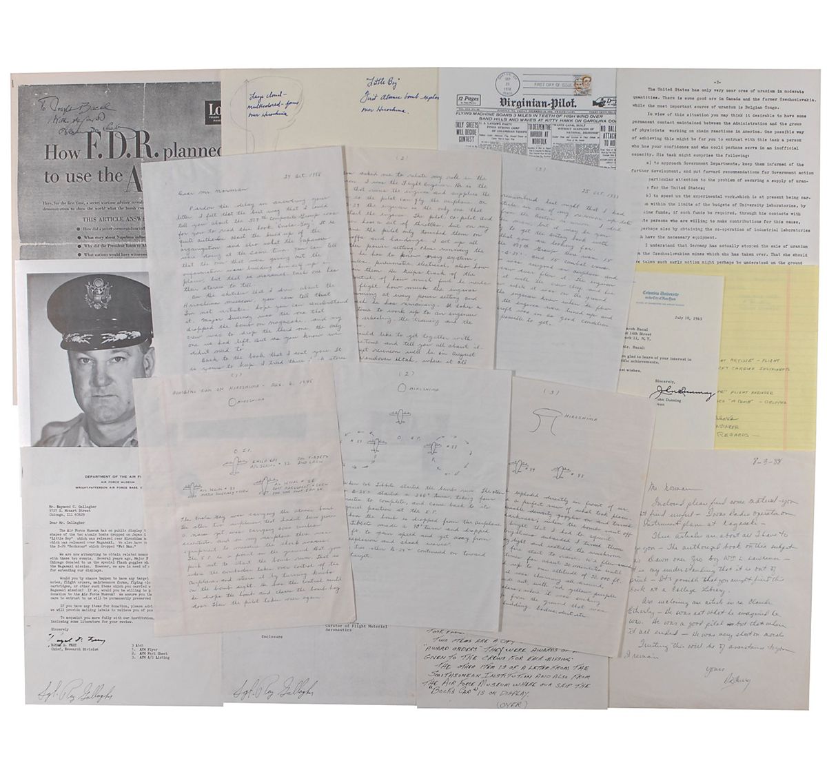 Other signed documents include material from Frederic Bock, Ray Gallagher, R. D. Curry, and George R. Caron, all crew members of the Atomic Bomb runs. Also included are photos, souvenir typescripts, letters, checks and cards: Paul Tibbetts (3), Thomas Ferebee (4), Charles W. Sweeney, George R. Caron (2), John R. Dunning, Alexander Sachs, Joe S. Stiborik, Kermit Beahan, and Abe M. Spitzer. In overall fine condition.