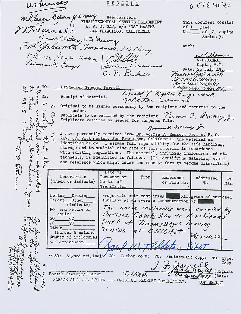 Souvenir copy of a document regarding the delivery of the atomic bombs, 8.5 x 11, signed in felt tip and ballpoint by Paul Tibbets, Frederick L. Ashworth, and future Nobel Prize in Physics winner Norman F. Ramsey, Jr. Document also bears numerous inherent printed signatures. In fine condition.