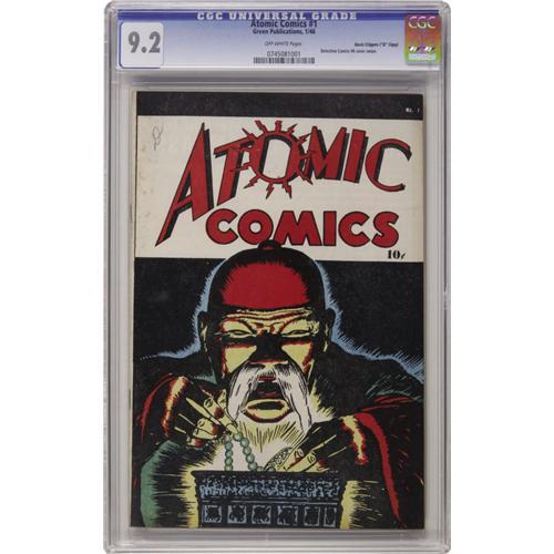 <B>Atomic Comics #1 Davis Crippen ("D" Copy) pedigree (Green Publishing Co., 1946) CGC NM- 9.2 Off-white pages.</B></I> The DC fan could have been forgiven for thinking this was a National Periodical Publication: the cover swipes <B>Detective Comics</B></I> #8, the logo resembles that of a certain <B>Action</B></I>-packed mag, and there are two ex-DC characters appearing, namely the Radio Squad (whom we know from <B>More Fun Comics</B></I>) and Barry O'Neill (who appeared in <B>Adventure Comics</B></I>). So if you collect Golden Age DC, this oddity should be on your shopping list as well. Overstreet 2006 NM- 9.2 value = $1,775. CGC census 10/06: 5 in 9.2, 4 higher. <I>From the Crippen Collection.</B></I><BR><BR><b>Shipping:</b> Slabbed Comic (<a target="_blank" href="http://www.heritageauctions.com/common/shipping.php">view shipping information</a>)