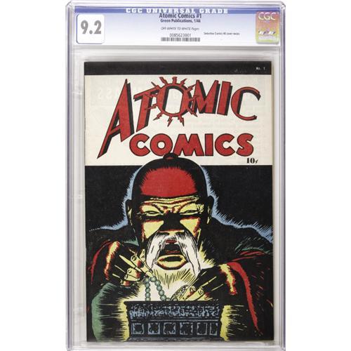 <B>Atomic Comics #1 (Green Publishing Co., 1946) CGC NM- 9.2 Off-white to white pages.</B></I> This Fang Gow cover, which is considered a "classic" by Overstreet, is a swipe of Creig Flessel's <B>Detective Comics</B></I> #8 cover art. An interesting note about this series is that the covers for all four issues were printed without cover gloss. The book contains a Radio Squad feature by Superman creators Jerry Siegel and Joe Shuster. Barry O'Neal also puts in an appearance. An extremely nice black cover copy! Overstreet 2006 NM- 9.2 value = $1,775. CGC census 12/06: 5 in 9.2, 4 higher.<BR><BR><b>Shipping:</b> Slabbed Comic (<a target="_blank" href="http://www.heritageauctions.com/common/shipping.php">view shipping information</a>)