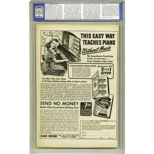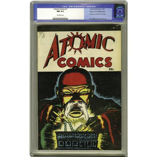 <B>Atomic Comics #1 Mile High pedigree (Green Publishing Co., 1946) CGC NM 9.4 Off-white pages.</B></I> DC wasn't pleased! Not only did this title rip off the <B>Detective Comics</B></I> #8 cover for its first issue, it also enticed Superman creators Jerry Siegel and Joe Shuster to contribute a story. This is the Mile High copy, so the condition isn't a surprise; to date CGC has certified a higher grade to just one other copy of #1. Overstreet 2006 NM- 9.2 value = $1,775. CGC census 3/06: 3 in 9.4, 1 higher.