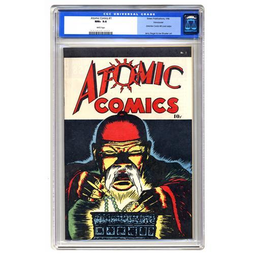 <B>Atomic Comics #1 Vancouver pedigree (Green Publishing Co., 1946) CGC NM+ 9.6 White pages.</B></I> The Vancouver books are exceeding collectors' expectations when it comes to how white a Golden Age comic can be. Even the 9.4 Mile High copy of this book looks dingy by comparison! Hype, you say? Then by all means, have a look at our scan and judge for yourself. This issue has a very DC-ish look to it, seeing as how the cover swipes <B>Detective Comics</B></I> #8, the logo is similar to that of <B>Action Comics</B></I>, and it even has a story of Jerry Siegel and Joe Shuster's Radio Squad (of <B>More Fun Comics</B></I> fame). Overstreet 2006 NM- 9.2 value = $1,775. CGC census 3/06: 1 in 9.6, none higher.