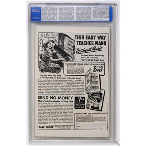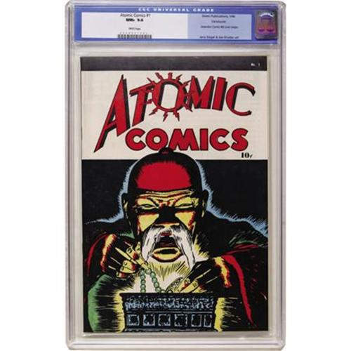 <B>Atomic Comics #1 Vancouver pedigree (Green Publishing Co., 1946) CGC NM+ 9.6 White pages.</B></I> The Vancouver books are exceeding collectors' expectations when it comes to how white a Golden Age comic can be. Even the 9.4 Mile High copy of this book looks dingy by comparison! Hype, you say? Then by all means, have a look at our scan and judge for yourself. This issue has a very DC-ish look to it, seeing as how the cover swipes <B>Detective Comics</B></I> #8, the logo is similar to that of <B>Action Comics</B></I>, and it even has a story of Jerry Siegel and Joe Shuster's Radio Squad (of <B>More Fun Comics</B></I> fame). Overstreet 2007 NM- 9.2 value = $1,775. CGC census 6/07: 1 in 9.6, none higher.<BR><BR><b>Shipping:</b> Comics - Slabbed (certified) (<a target="_blank" href="http://www.heritageauctions.com/common/shipping.php">view shipping information</a>)