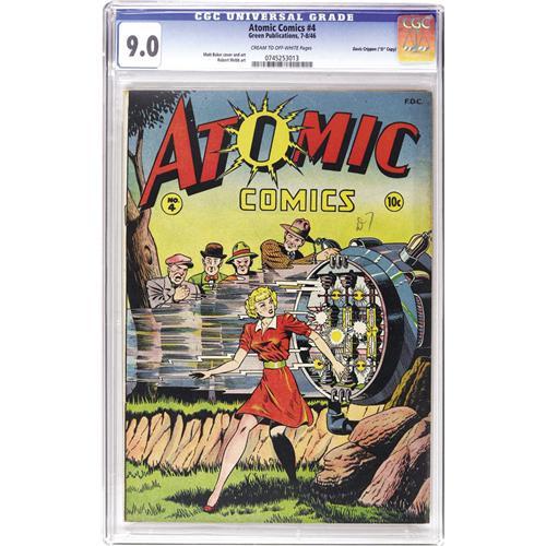 <B>Atomic Comics #4 Davis Crippen ("D" Copy) pedigree (Green Publishing Co., 1946) CGC VF/NM 9.0 Cream to off-white pages.</B></I> The highly collectible Matt Baker provided the cover art for this issue. We're not sure what's going on here exactly, but we sure dig the Baker gal! While we see #1 of this series quite often, the later issues seem tougher to find, so give this one a good look, Baker fans! Overstreet 2006 VF/NM 9.0 value = $406; NM- 9.2 value = $550. CGC census 6/06: 1 in 9.0, 1 higher. <I>From the Crippen Collection.</B></I> <BR><BR><B>Important notice:</B> Heritage usually auctions material at the rate of 200-250 lots per hour. On some occasions eBay Live bid software or the Internet may not be able to keep up with the pace of the auction. We recommend placing a realistic absentee bid now as insurance to avoid disappointment. Occasionally the auctioneer may eliminate or reject an eBay Live bid, and the auctioneer may also reopen a lot after the close of the eBay live bidding (usually because we missed an audience bid), and may reject your bid even if it shows you as the winning bidder. By bidding via eBay Live, you agree that Heritage may award the lot to another bidder at its sole discretion under the circumstances described above or any other reasonable circumstances. Since eBay bids are not shown to us until we open the lot on the floor, we treat those bids just like floor bids. In most cases the floor responds before the eBay bid is presented to us, due to Internet lag time, so for consistency we have made it a policy that floor bids are always considered first over tie eBay live bids. Also please note that all Heritage lots purchased through eBay Live carry a 22.5% Buyer's Premium. Please make sure you read the Terms and Conditions before you bid. This lot is being auctioned in conjunction with a live floor auction by Heritage Auction Galleries. All final auction and invoice information will be supplied by Heritage Auction Galleries, and all other information should be considered preliminary. Lot:41001 <BR><BR><B>Winning Notification and Billing:</B> After the FINAL session in this auction is complete, Heritage will send e-mail and snail mail invoices. This process normally takes several days. All final auction and invoice information will be supplied by Heritage Auction Galleries, and all other information should be considered preliminary. <BR><BR>This auction will be conducted on a live auction floor and over the Internet through eBay Live. If you choose to place an absentee bid, please take a moment to <font color='#0000ff'><u><a href='http://pages.ebay.com/liveauctions/help/before/laabsentee.html'>learn how eBay Live absentee bidding works</a></u></font><font color='#000000'>
