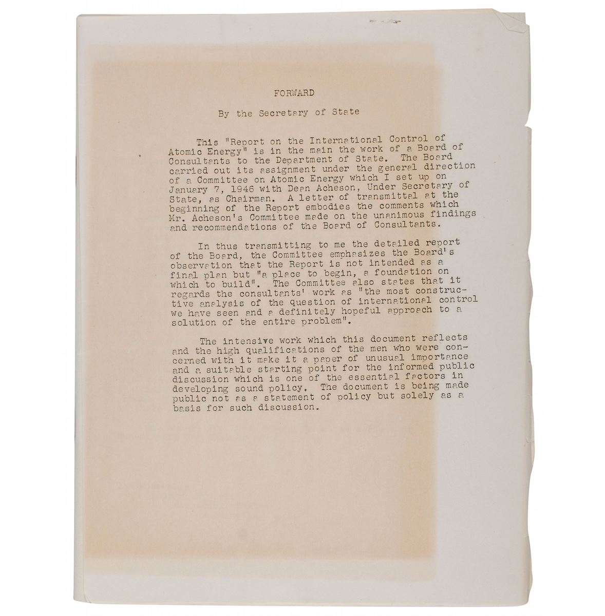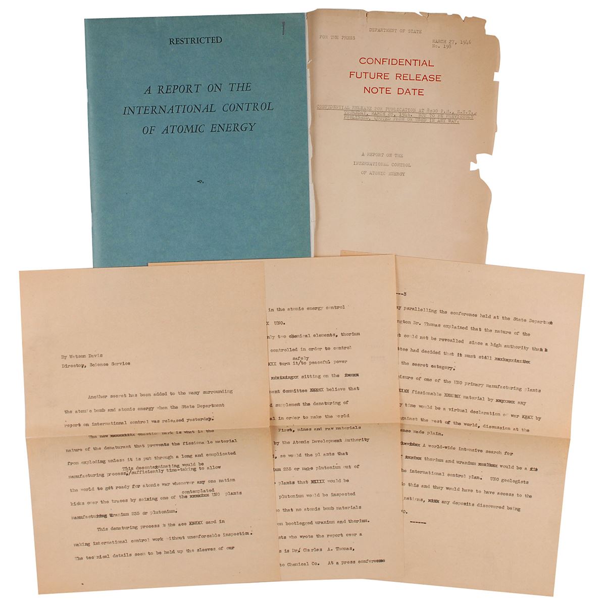 Collection of four items concerning atomic energy, including a true first printing of the Report on the International Control of Atomic Energy, generally known as the Acheson-Lilienthal Report, 76 pages, March 16, 1946, in original blue printed wrappers labeled “Restricted”; a mimeographed statement by Acheson, one page, stapled to the first page of the report; a one-page mimeographed cover to the report labeled in bold red text, “Confidential, Future Release, Note Date,” stating the release date of March 27, 1946; and a typescript of a draft for an article about the report by Watson Davis, three pages, with two pages of his accompanying handwritten notes. In overall very good to fine condition. This important report of the early Cold War era, not released to the public until March 28, 1946, discussed possible methods for the international control of nuclear weapons and the avoidance of future nuclear warfare.