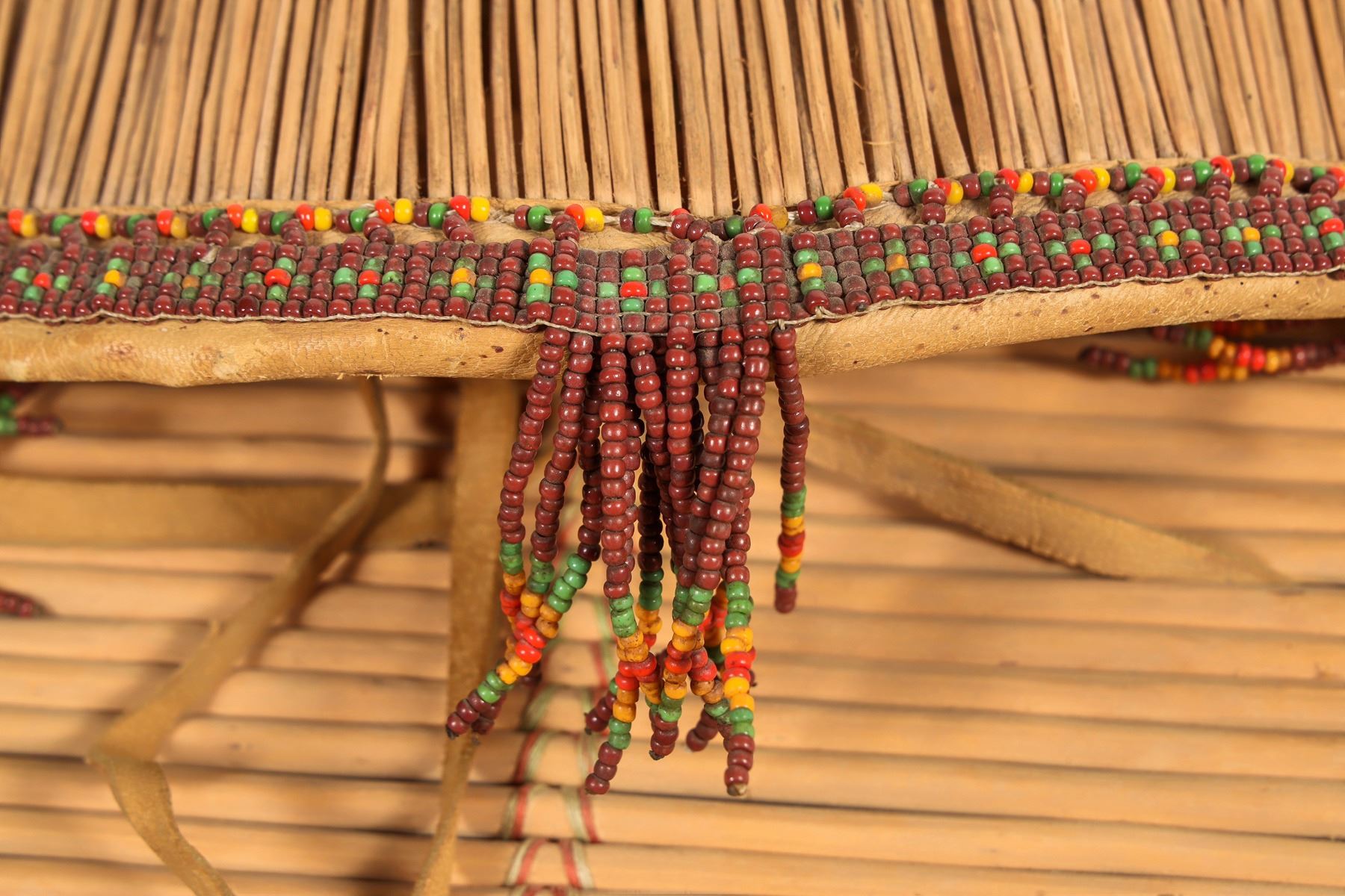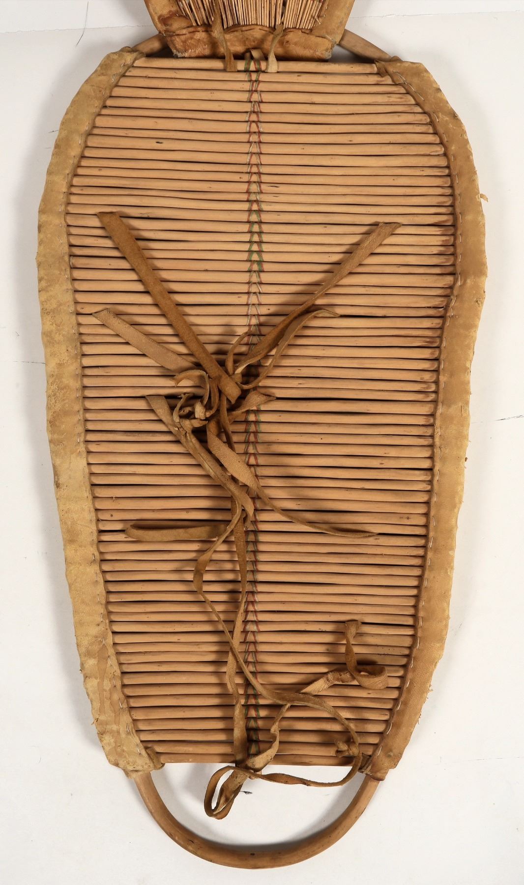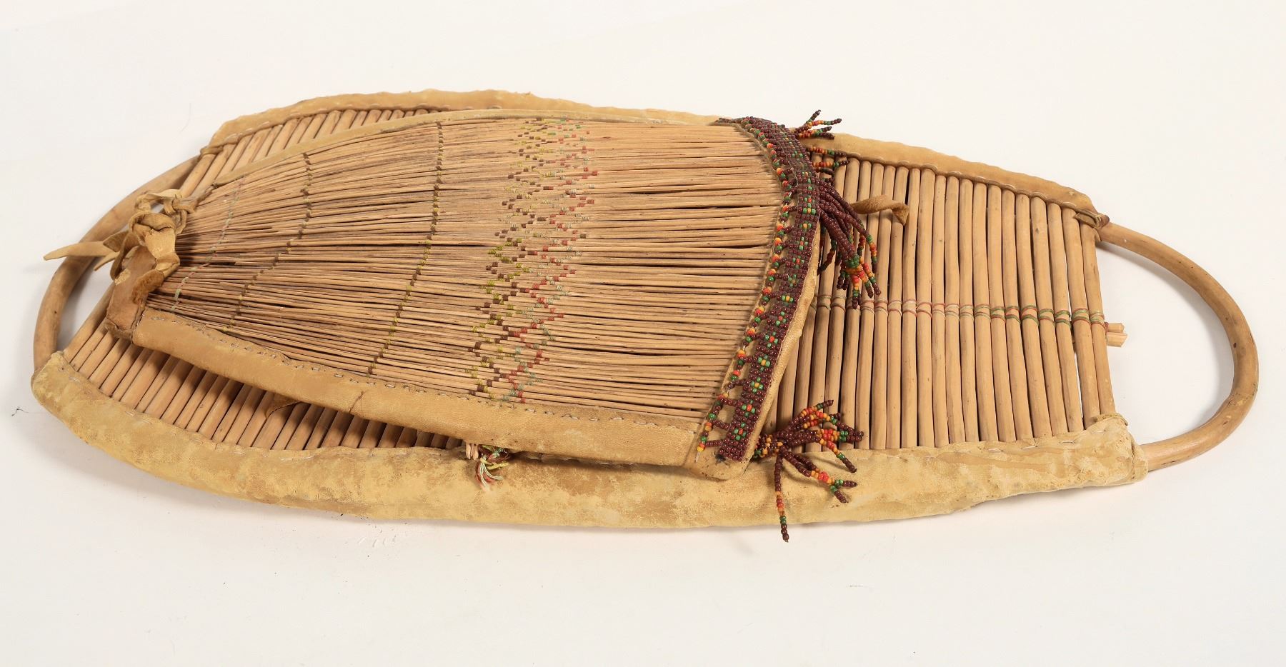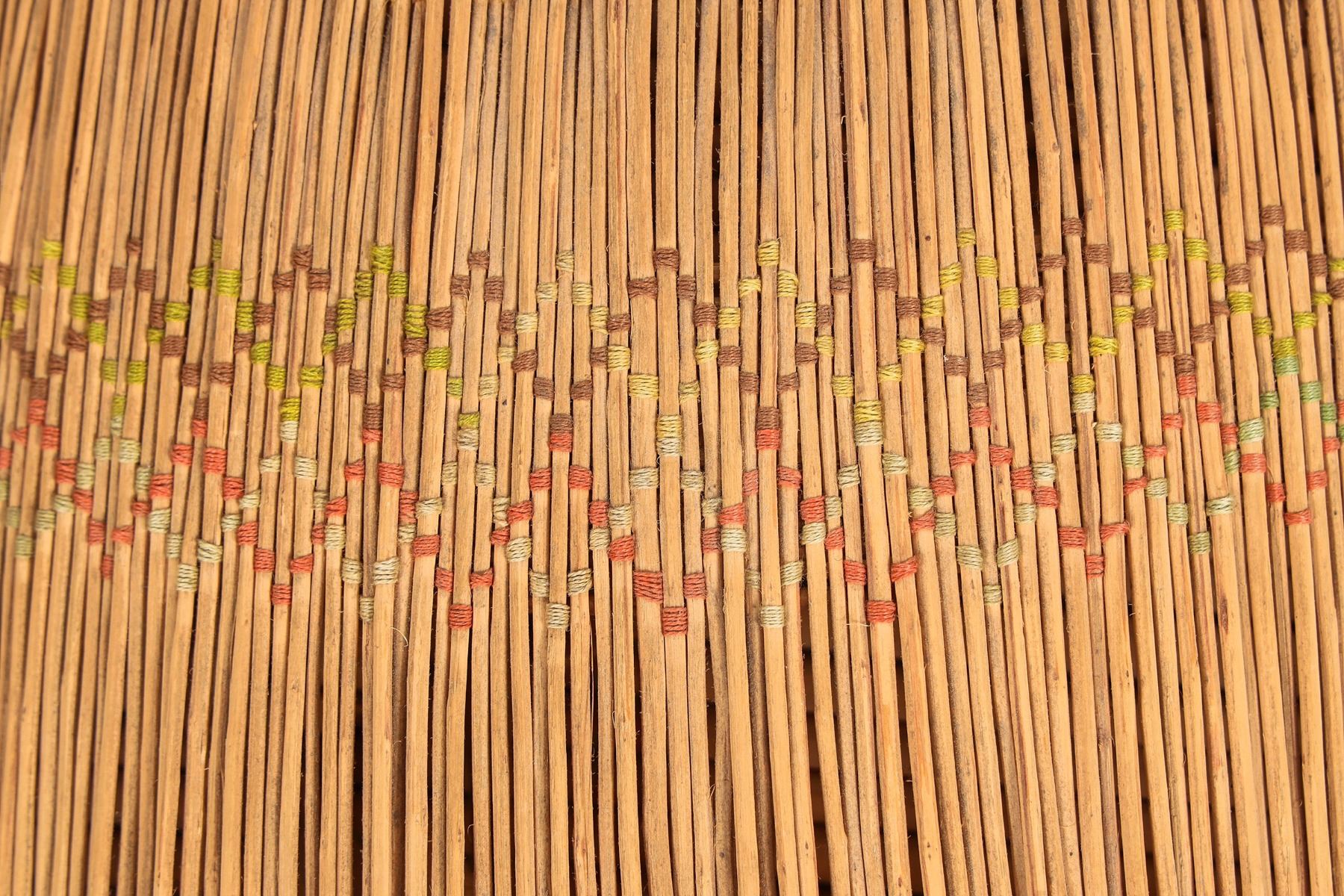 This is a cradleboard made by the Atsuqwi (Hat Creek) Tribe of Northern California. C.1920s. It is in the girls design.  The vertical rod construction on the back is unique and may indicate the individual who made this originally. Strut rods are missing in action. 24 in. X 12 in. Chokecherry, willow shoots, and pine root construction. Listed in Biddy p.105. Please see photos for details.