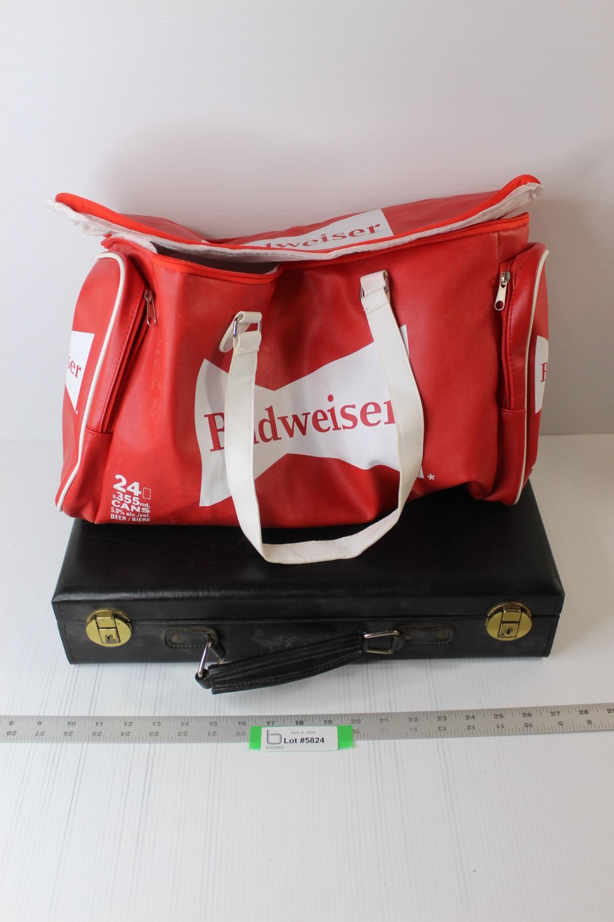 Attache Case, Budweiser Bag, (2) Seagate GoFlex Portable Drives With Cables, Glass Vase, Dye, etc.
