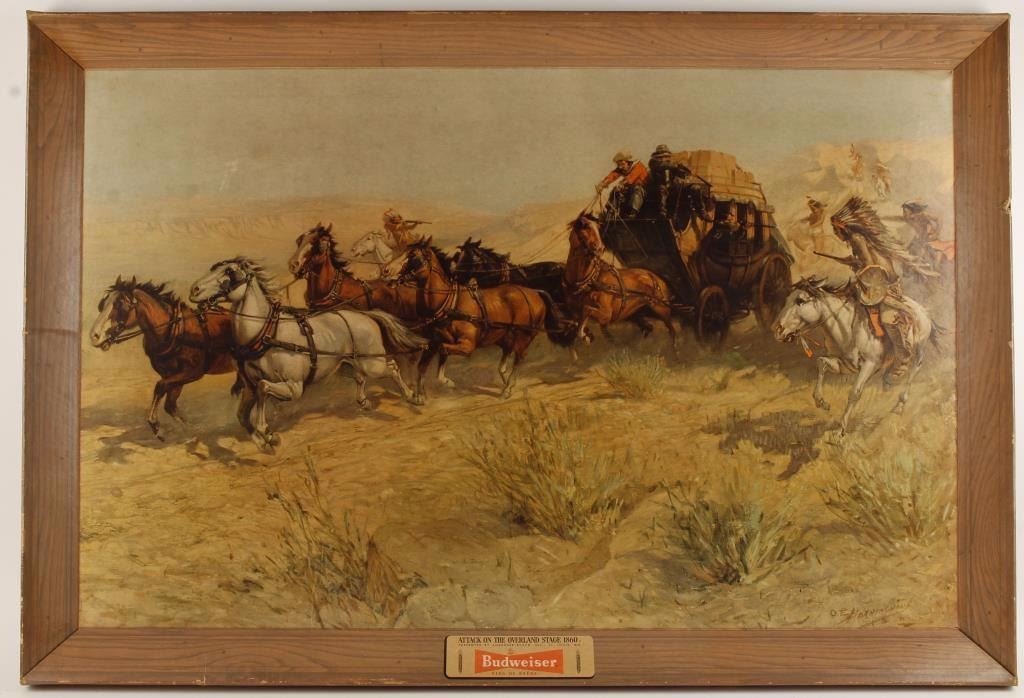 Vintage 1950's Budweiser advertiser after the painting Attack on the Overland Stage produced by O.E. Berninghaus. Cardboard self framed with 'plaque' that reads "Attack on the Overland Stage 1860 / Presented by Anheuser-Busch, Inc. St. Louis, Mo. / Budweiser / King of Beers". Measures 41.5" x 28". Very seldom seen. Bright image. Condition is good with minor damages.