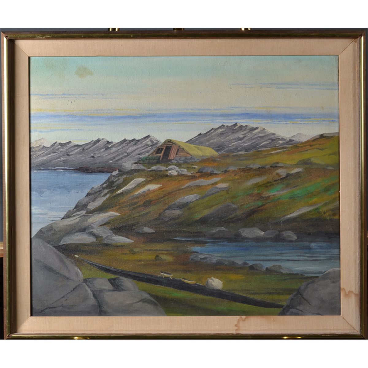 Painted to depict a seaside cabin against a rocky shore, signed on back of frame Rosen, Charles Rosen (1878-1950) was a New York artist known for his lanndscapes and harbor views. 22" H x 22.25" W sight 26.5" H x 36" W framed. Circa 20th century. Private collection Bloomfield Hills, MI.