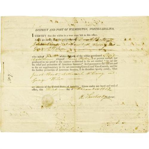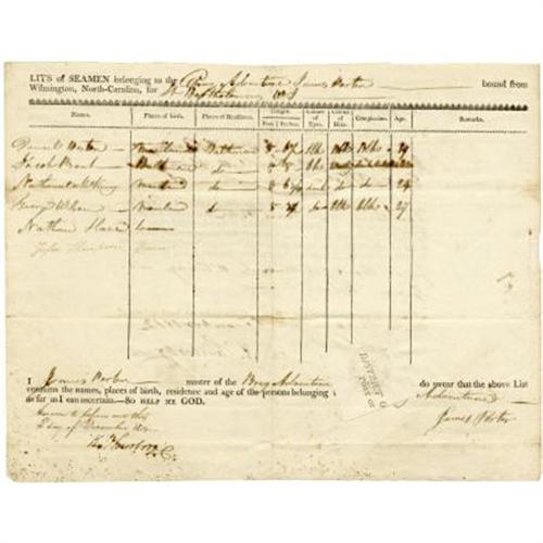 <B>Attested Crew List for the Brig </B></I><B><I>Adventure</B></I></B></I><B> of Wilmington, South Carolina, 1812</B></I> 15.5” x 12”, two pages (front and verso), partially printed, December 3, 1812, Wilmington, South Carolina. The crew list for the Brig <I>Adventure </B></I>signed by the ship’s master James Porter. It is to comply with “An act for the relief and protection of American Seamen”. Interestingly, out of the entire crew of six men, all were identified as Black or Dark Mulatto, including one man named Nathan Slave. Some holing, else near fine.<BR><BR><BR><b>Shipping:</b> Flat Material, Large (<a target="_blank" href="http://www.heritageauctions.com/common/shipping.php">view shipping information</a>)