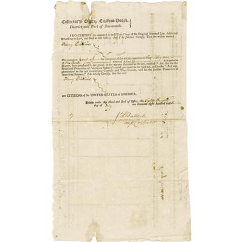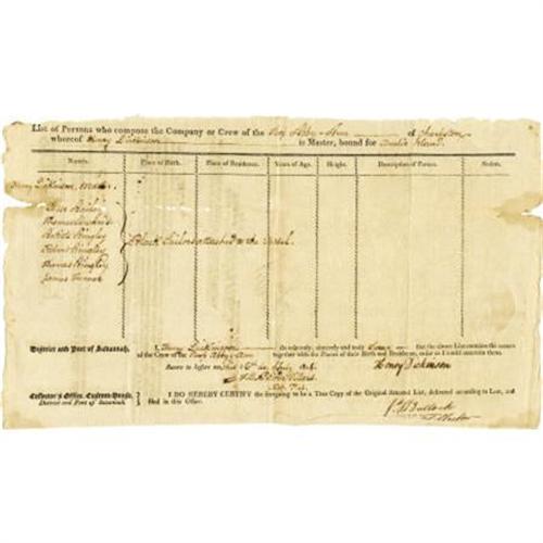 <B>Attested Crew List for the Sloop </B></I><B><I>Abby-Ann</B></I></B></I><B> of Charleston, 1814</B></I> 13” x 7.5”, two pages (front and verso), partially printed, July 16, 1814, Charleston, South Carolina. The crew list for the Sloop <I>Abby-Ann </B></I>signed by the ship’s master Henry Dickinson. It is to comply with “An act for the relief and protection of American Seamen”. Interestingly, the entire crew of six men were “Black Sailors attached to the vessel”. The list fails to identify the place of birth, description, or nationality of the crew. Ragged edge and some holing, else near fine.<BR><BR><BR><b>Shipping:</b> Flat Material, Large (<a target="_blank" href="http://www.heritageauctions.com/common/shipping.php">view shipping information</a>)
