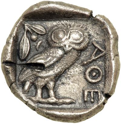 Attica, Athens, c. 430 BC. AR Tetradrachm (16.63 g). Head right of Athena in crested helmet with leaves and palmette decoration. Reverse: Owl standing right, sprig of olive and crescent behind; ethnic at right. Sv. pl. 14, 10; Dewing 1618. Test cut on reverse; porous. Sharpness of Extremely Fine.