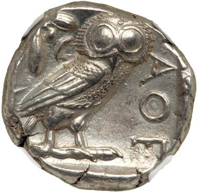Attica, Athens, c. 440-404 BC. AR Tetradrachm (17.17g). Head of Athena right, wearing crested helmet ornamented with three olive leaves and palmette decoration. Reverse: Owl standing right, head facing, sprig of olive and crescent hehind; to right, ethnic; all within incuse square. Sv. plate 14, 25; Dewing 1621. NGC graded Choice AU: Strike 4/5; Surface 3/5.