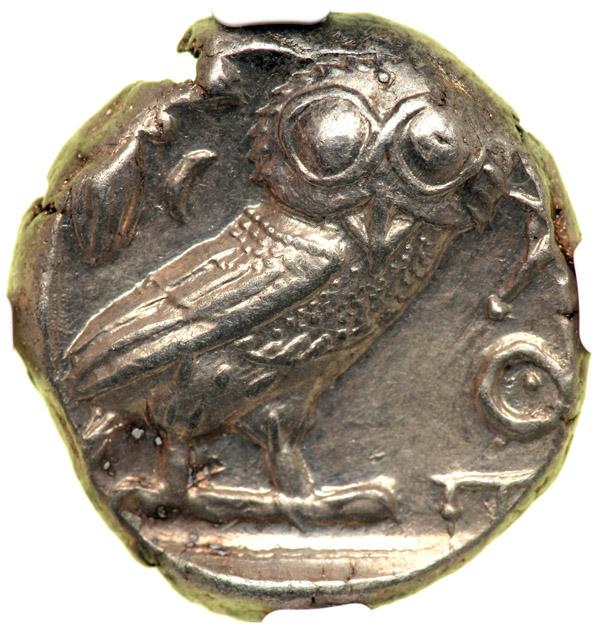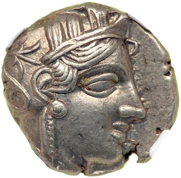 Attica, Athens, c. 440-404 BC. AR Tetradrachm (17.18 g). Head right of Athena wearing crested helmet ornamented with three olive leaves and palmette decoration. Reverse: Owl standing right, head facing, sprig of olive and crescent behind; to right, ethnic; all within incuse square. Sv. pl. 17, 10; Dewing 1622. NGC graded Ch. AU; Strike 3/5; Surface 5/5.