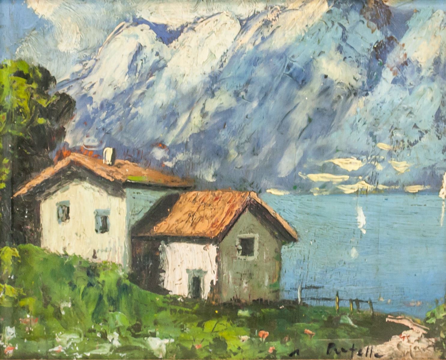 Oil on board, framed. Featuring an impressionist landscape scene by the coast. Signed A. Pratella on the lower right corner. Attributed to Attilio Pratella (1856-1949, Italian). 20 x 23.5 cm (8 x 10 in). Frame:41 x 46 cm (16.5 x 18 in). PROVENANCE: This lot carries limited provenance from a Southern Ontario estate