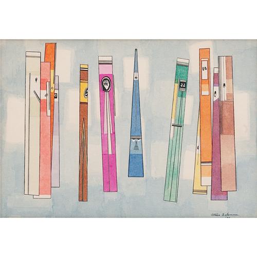 Attilio Salemme (American, 1911-1955), "Time of Inspection", c. 1950; watercolor and ink/paper, 8.5" x 12.5", signed; label on verso with artist’s address. Salemme had one-man exhibitions at the Passedoit Gallery, Saidenberg Gallery, Grace Borgenicht Gall
