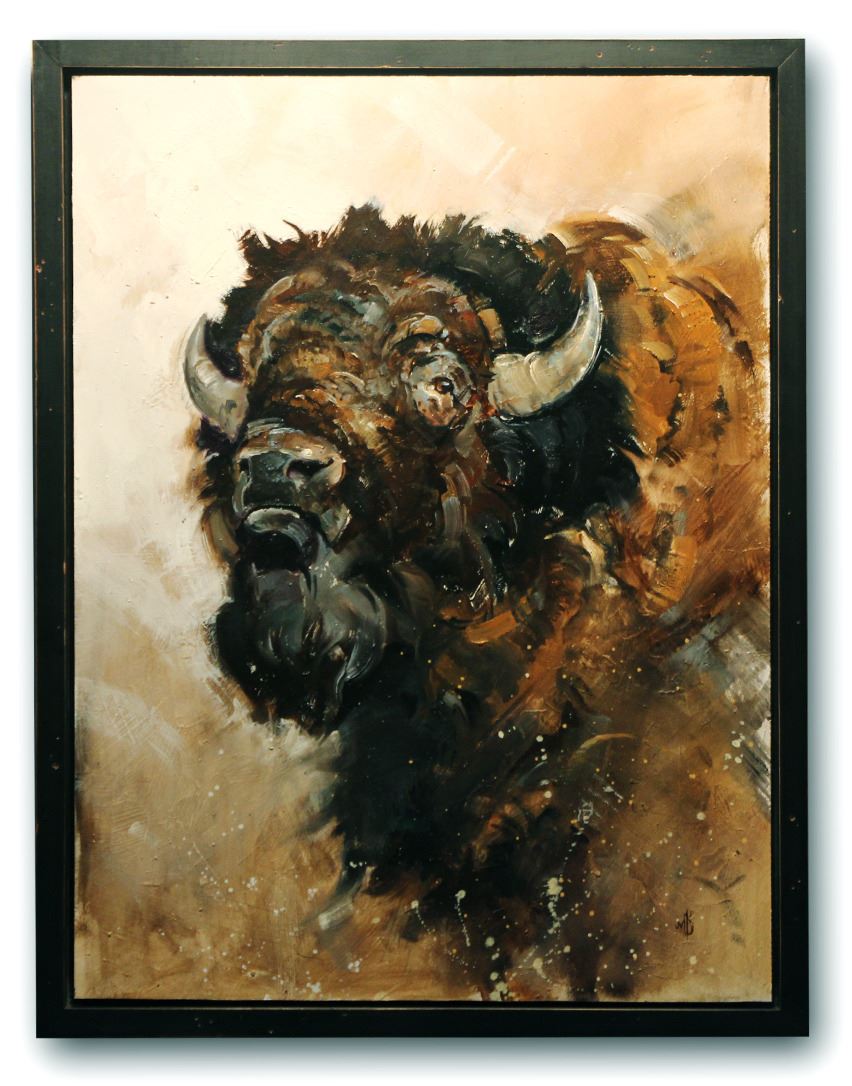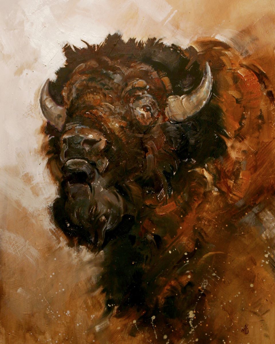 Artist: Mark Kelso. Title: Attitude. Medium: Oil on Panel. Size: 20" x 16". Framed size (if applicable): 22" x 18" Artist's description: I'm constantly awed by the power of the American Bison when they suddenly go from a quiet, sedentary state to one of violent aggression. It's particularly exciting when you're close to them - there's no mistaking that this animal is a force to be reckoned with! I wanted to try to capture some of the energy and dynamism of that moment of aggression through the look in the eye, through energetic brush work and chiseled forms, and a simple, but forceful composition. Shipping from ZIP CODE 46106.